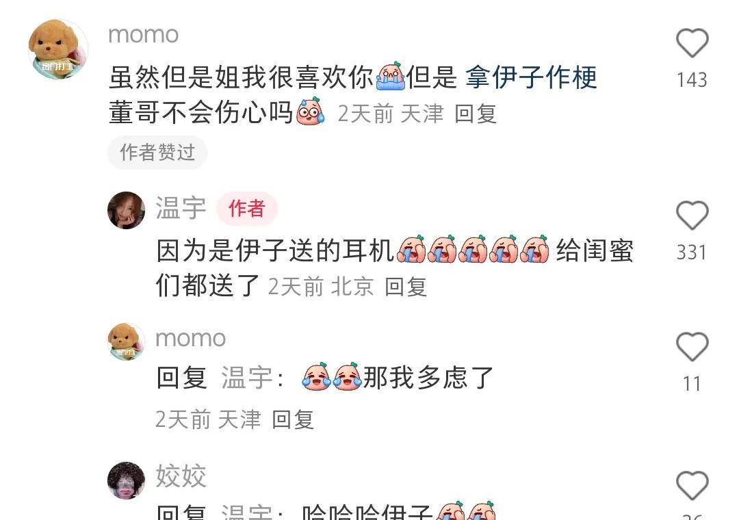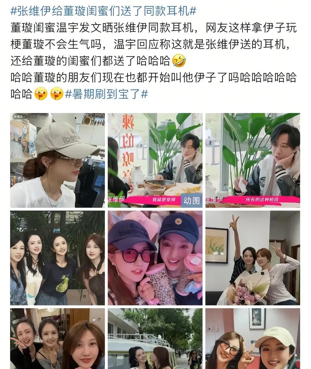 张维伊是情场高手,不止拿捏住董璇,还拿捏住她的闺蜜。老妻少夫感情最怕就是闺蜜们蛐蛐,就像现在网友们一样。那怎么办呢?贿赂,收买,让她们说好话,这不,张维伊给董璇闺蜜们送他自己戴的同款耳机。 董璇闺蜜称他为伊子,接纳了他。恋爱脑的女人,只要旁边没人天天蛐蛐,那对于情场老手就是手拿把掐。