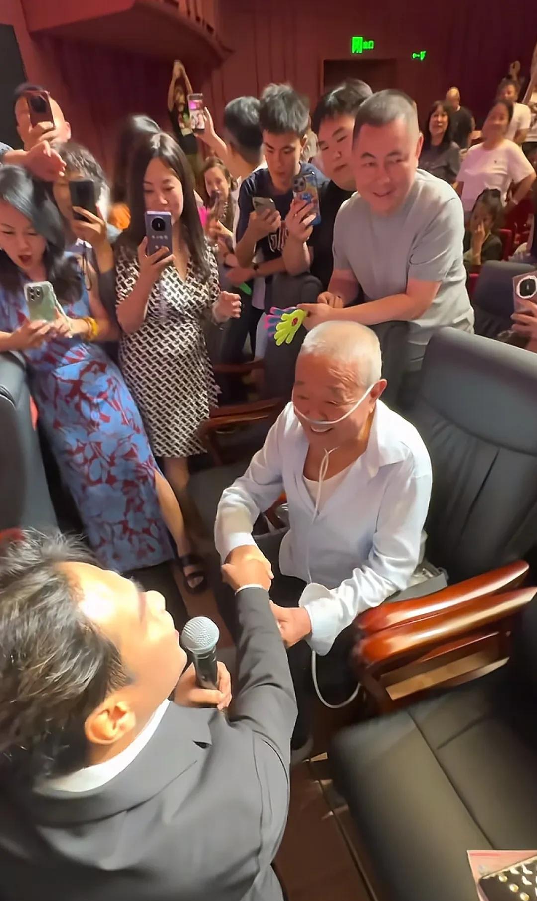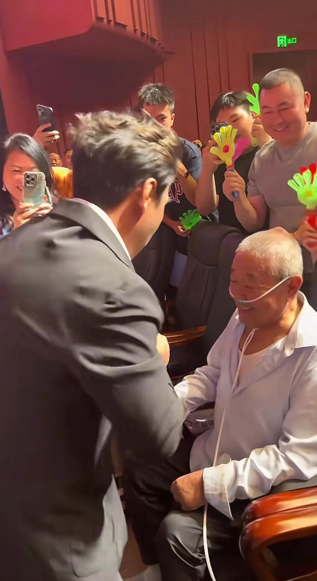 “刘老根大舞台”巡演太原站,宋小宝上台演出后看到现场观众席,出现一名特殊观众,立马跳下舞台,翻越几排座椅立正后单膝下跪磕一个。并给老人送了一个他签名的二人转手绢。 这名观众太特殊,是一位插着氧气罐的老人,为了看宋小宝让家人给他买票到现场。 宋小宝做没得说,有艺德,人品也是好样。主办方也可以,放这样的观众入场是要承担风险。