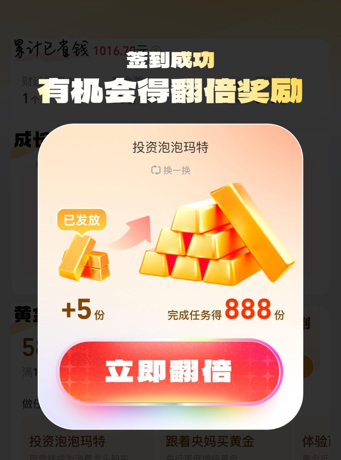 昨日国际金价小幅上涨,支付宝攒的0.42克黄金赚了0.48元,心情美美哒[星星眼] 我不大喜欢凑热闹,就喜欢在支付宝领取免费的黄金票,之后兑换成黄金! 打开支付宝搜索~黄金票,签到、打卡,浏览“蛋定生财”、“稳定理财”,喂喂小鱼,8份黄金票到手了! 攒够100份黄金票,就可以提取黄金! 攒黄金票,就是攒黄金! 积少成多,聚沙成塔,一样可以攒到属于自己的小欢喜! #记录我的2025#