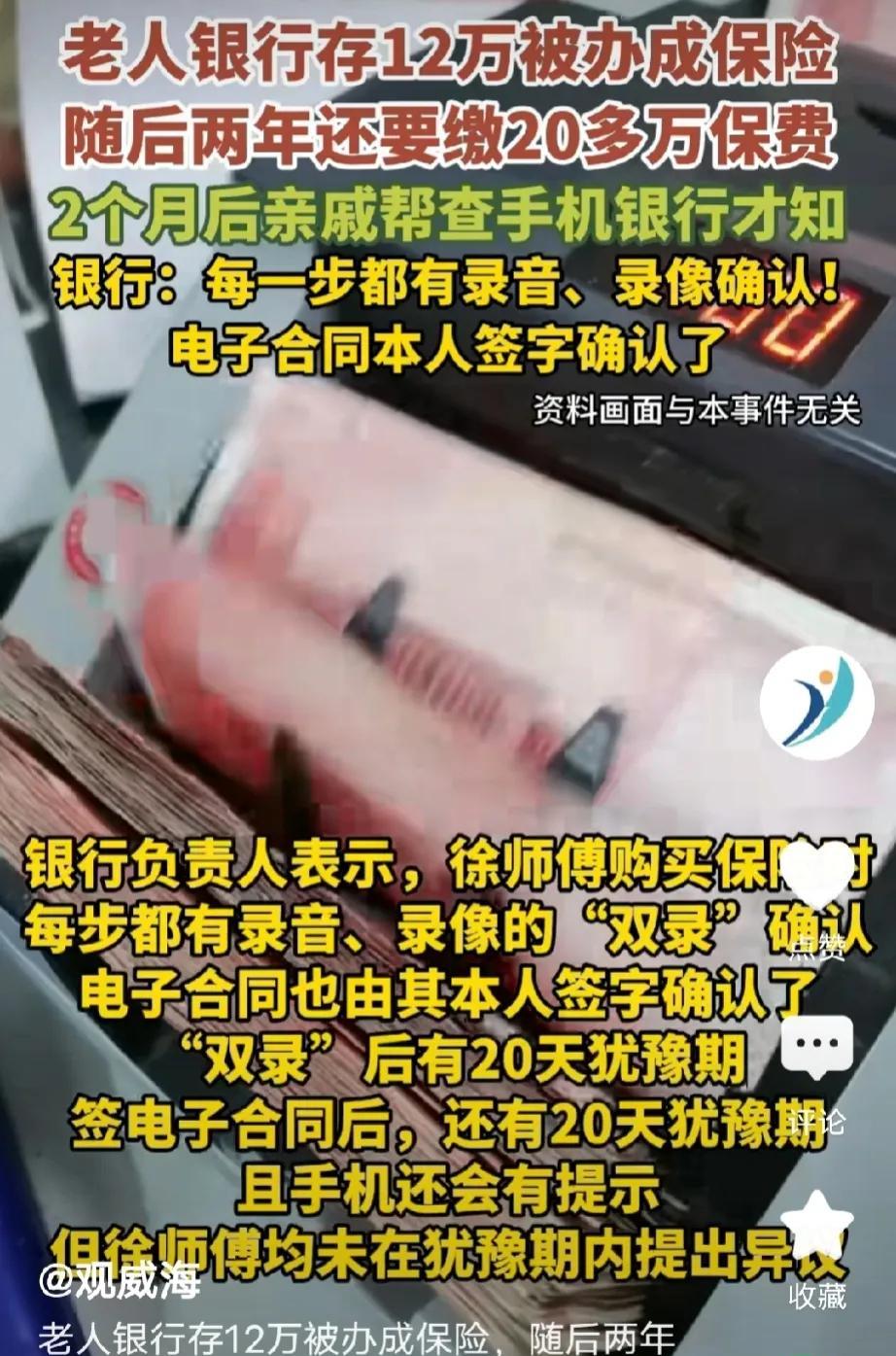 陕西西安,70岁男子去银行办理12万存款,却稀里糊涂被经理忽悠买了12万保险,等他发现时,已经过去2个月,更让他接受不了的是,后续还要交20多万保费,男子崩 溃了,自己退休金不高,去哪里找那么多钱交保费,他去银行理论,银行一番话差点没把他气晕。 8月26日,观威海报道,徐大爷有一笔12万的定期存款准备到期了。 因为现在不需要用到大钱,所以他和老伴商量,继续存定期。 6月11日那天,徐大爷打算前往银行办理,就在他准备出门的时候,接到一个银行客户经理贾某的电话。 贾某是西安市高新区某家银行的客户经理,因为徐大爷之前住那边的时候,经常到他们银行办理存取款。 时间久了,就跟贾某熟悉了,平时有什么业务,贾某都推荐给徐大爷。 不过,如今他们搬到了草滩区,去到那边相对比较远。 那天,贾某告诉徐大爷,现在有一个利息很高的存款,徐大爷可以过去了解一下。 徐大爷听完,眼睛立刻就亮了,真是好巧不巧让自己遇上这等好事,哪怕再远,他都过去看看。 徐大爷准备出门了,他的老伴考虑到他记性不好,特意三番五次提醒他:你是去办理存款的。 徐大爷到了该银行后,贾某热情招呼,给他各种劝说和开导,他告诉徐大爷3年定期存款利率超过2.5。 大爷很信任贾某,毕竟也认识这么多年了,他说划算,那就听他的。 之后,银行工作人员让大爷录音录像,全程很简单,徐大爷只需要回答“是、不是或者同意、不同意”。 办理结束后,徐大爷开开心心回家了,到家后,他告诉老伴存了3年的定期存款,不过银行纸质存单没有了。 因为是通过熟人介绍过去的,而且钱在银行里应该信得过,两人也没多想,慢慢地,就把这个事给忘了。 转眼到了7月底,有一个年轻的亲戚来家里做客,几个人聊到了关于存钱一事。 亲戚看了徐大爷手机才知道,他办理的根本不是什么定期存款,而是买12万的保险。 两老一听差点没气晕过去,当天直接赶往银行确认,银行工作人员告诉他们,的确是买了保险。 而且根据险种要求,还要交两年保费,每年12万元。 徐大爷一听,气得几天吃不好、睡不着,他们两老退休金本就不高,去哪里要那么多钱交保费? 之后的几天徐大爷和老伴接连给银行打投诉电话,客服承诺会在一周后处理,可一周过去了,没有任何消息。 徐大爷又给银监会打电话,可银行那边却说,徐大爷并非不懂自己买了保险,因为他手机里有合同,而且银行有“双录”。 徐大爷联系了记者,他告诉记者,自己平时不太会用手机,那天是贾某和一个工作人员拿他手机操作的。 记者去银行找贾某,可贾某在休假,徐大爷的老伴说,即使是买保险,两个月过去了,他们也没有收到任何纸质合同。 工作人员称,徐大爷购买保险时,每一个步骤银行这边都对其进行了录音、录像的“双录”确认,而且电子合同也由他本人签字确认了。 徐大爷说,录音的时候,他不可以乱说话,只能说“是或者不是”、“同意或者不同意”,自己一直以为是在办理存款。 那么,徐大爷主张的退保是否合理? 根据《银行保险机构消费者权益保护管理办法》第22条规定,银行保险机构应当以显著方式向消费者披露产品和服务的性质、利息、收益、费用、费率、主要风险等可能影响消费者重大决策的关键信息。 同时,第23条规定,银行保险机构不得进行欺诈、隐瞒或者误导性的宣传,不得作夸大产品收益或者服务权益、掩饰产品风险等虚假或者引人误解的宣传。 在本案中,客户经理贾某以“高利息”为名,向徐大爷推荐所谓的存款产品,却未告知其真实的产品性质是保险,存在隐瞒产品性质和误导宣传的嫌疑。 《民法典》第147条规定,基于重大误解实施的民事法律行为,行为人有权请求人民法院或者仲裁机构予以撤销 。 徐大爷一直以为自己办理的是定期存款,直到亲戚查看手机才发现是保险,这表明他对所办理业务的性质存在错误认识。 这种错误认识并非是徐大爷自身故意造成的,而是贾某在沟通时只提及高利息存款,未明确告知是保险产品。 徐大爷在误以为是办理定期存款的情况下,按照银行工作人员的要求进行了录音录像和签字确认等行为。 徐大爷的退休金不高,而根据险种要求,他还要交两年每年12万的保费,这对他来说是一笔巨大的经济负担,会给他的生活带来严重影响,造成较大的经济损失。 虽然银行有“双录”且徐大爷在电子合同上签了字,但徐大爷称在“双录”时自己以为是在办理存款,只能回答“是”或“不是”“同意”或“不同意”,没有充分了解合同内容 。 并且,银行未提供纸质合同,徐大爷平时也不太会用手机,难以对保险合同的具体条款有全面、准确的了解 。 因此,综合来看,徐大爷的意思表示不真实,其基于重大误解实施了购买保险的民事法律行为,有权请求人民法院或者仲裁机构予以撤销该保险合同 。 对此,大家怎么看?#头号创作者激励计划# 关注@猫眼学法 学习更多法律知识