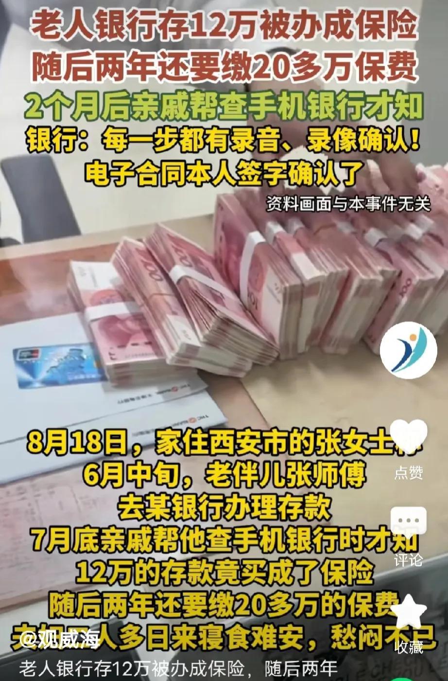 陕西西安,70岁男子去银行办理12万存款,却稀里糊涂被经理忽悠买了12万保险,等