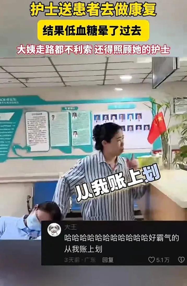 太感动了!近日,浙江一家医院内,一位护士在给患者做康复时,突然低血糖晕倒,患者是一位大姨,她本身自己走路也不利索,但还是一瘸一拐地推着护士来到护士站,解释了原因后,她霸气地表示“她的费用从我账上划”。