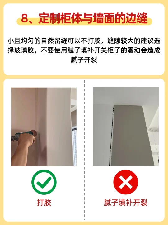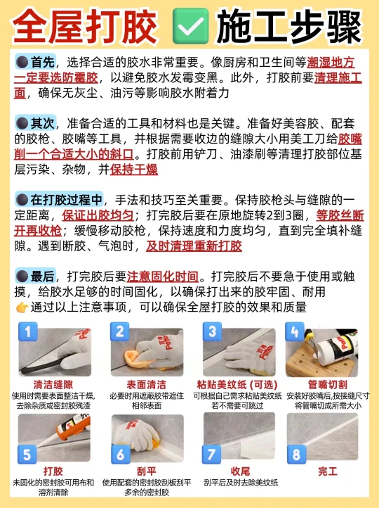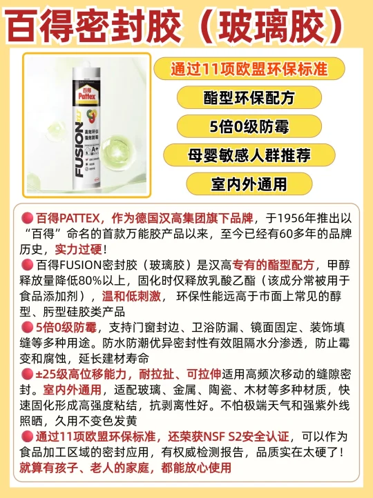 在装修过程中,胶粘剂虽看似不起眼,却对装修的美观度和耐用性有着直接影响。⚠️一旦用错胶,后期就会引起发霉、开裂、脱落等问题,严重时甚至会腐蚀装修材料,影响居住体验‼所以全屋打胶千万不能忽视 👉今天特意梳理了全屋需要打胶的地方,和品牌推荐及打胶注意事项,一定要码住~ ⚫干区(客卧区): ✅1、全屋定制柜子与墙面、地面、顶面的接缝处 ✅2、窗框与窗台石、墙面的接缝处🗺 ✅3、踢脚线与地面、墙面的接缝处🛌 ✅4、全屋门套、窗套与墙面的接缝处 ✅5、木饰面拼接缝及与墙面的接缝处 ⚫湿区(厨卫区): ✅6.马桶底座与地面的接缝处🚽 ✅7.浴室柜与墙面的交接处ㅤ🏷 ✅8.洗手盆与台面的接缝处🛋 ✅9、浴缸周边的缝隙🛁 ✅10、卫生间玻璃隔断与墙面、地面的接缝处 ✅11、厨房台面与墙面的接缝🏷 ✅12、洗菜盆与台面的接缝🚿 ✅13、厨房灶台与台面的接缝🔖 ✅14、厨房吊柜与墙面的接缝💡 ✅15、集成吊顶收边条与墙面接缝处 - ⭕装修工人带的胶一般质量都不好,气味也很大,打上好几天都是很刺激的胶味儿,还都是不防霉的,用久了容易发黄,长黑霉点还容易裂,所以一定要自己买! ✅推荐百得密封胶(玻璃胶),专有的酯型配方,温和低刺激, 环保性能远高于市面上常见的醇型、肟型硅胶类产品! ⭐无论是室内还是室外都可以用,像是水池台面、马桶底座都能用,5倍0级防霉,完全不用担心时间久了胶会发霉发黄 ⭐通过11项欧盟环保标准,还荣获NSF S2安全认证,可以作为食品加工区域的密封应用,有权威检测报告,品质实在太硬了!就算有孩子、老人的家庭,都能放心使用~ 装修细节 装修避坑装修知识打胶收缝 打胶 哪些地方需要打胶 全屋收缝 全屋打胶 玻璃胶 防霉玻璃胶 装修干货 美容胶封边 全屋美容胶收边收口打胶 汉高百得 百得玻璃胶百得密封胶