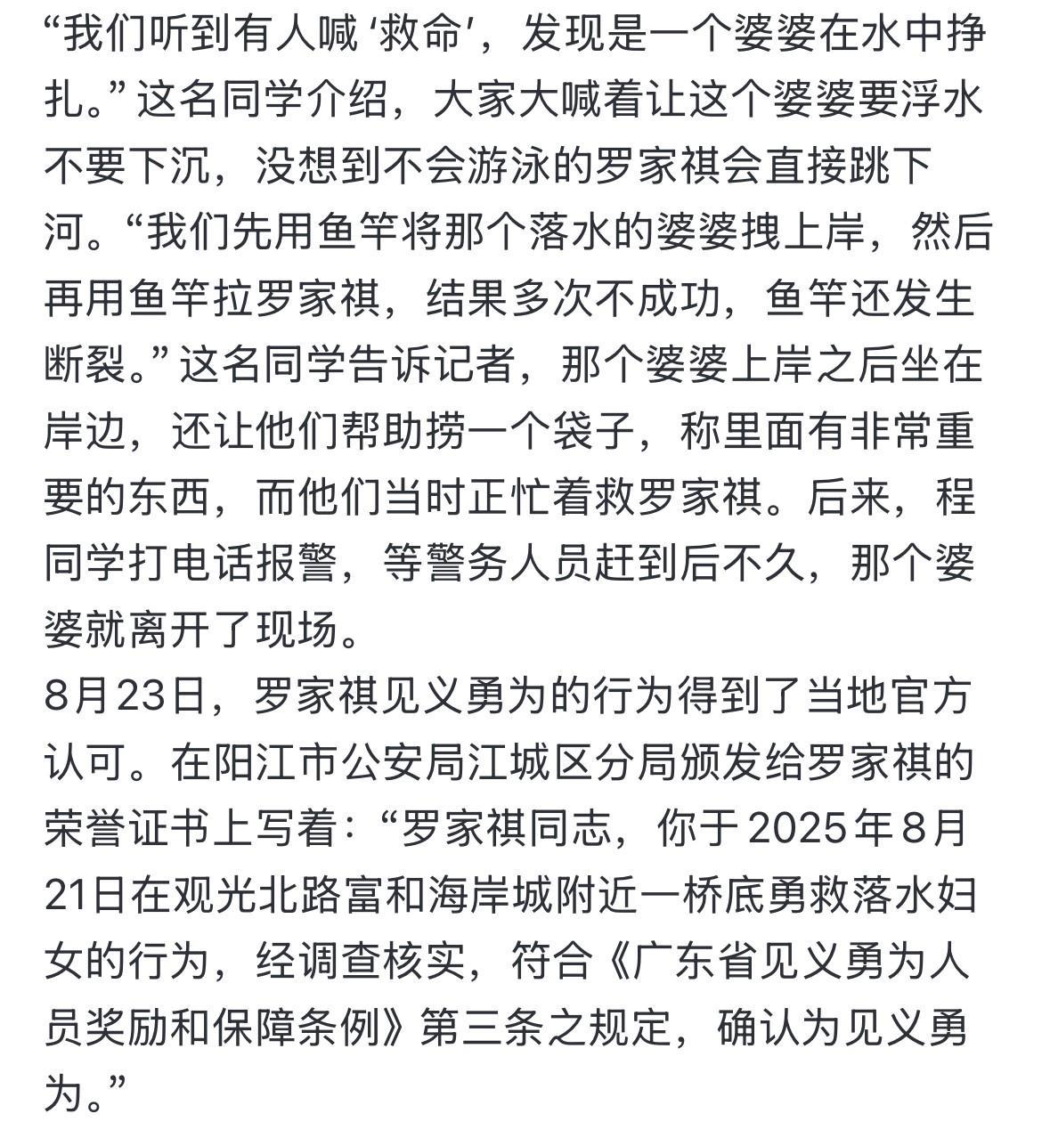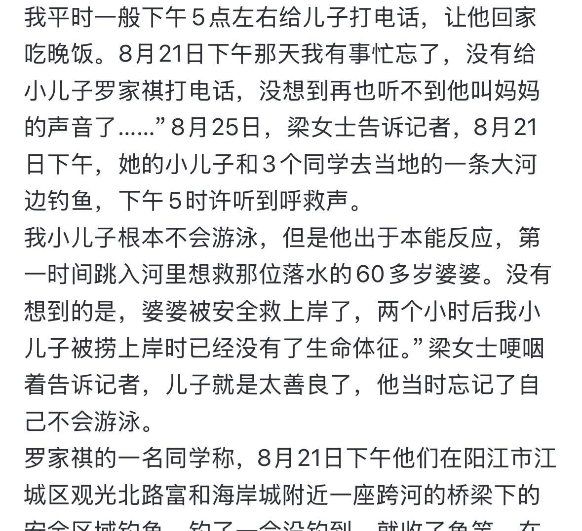 广东阳江17岁少年在跳水救人前,口袋里还装着他刚花4000多元买的新手机[流泪]他自己都不会游泳,但在关键时刻,却毫不犹豫拼尽全力救人。 这个少年名叫罗家祺,出生于2008年。原本再过几天,他就要读高三了。 悲剧发生在8月21日,当天下午,他和另外三个同学在河边钓鱼。在那个过程里,突然听见有人呼救。 几位少年循着声音找过去,发现落水的是一个老婆婆。彼时,罗家祺鞋子都没顾得上脱掉,口袋里那个价值4000多元的新手机也没有来的及掏出来,就跳入了水中。 他太善良了,从头至尾压根没有考虑到自己。最终,婆婆成功获救,而他自己年轻的生命却永远的留在了水里面。 他8月17日才刚刚过的17岁生日啊,未来的人生还有很多种可能。然而,所有的一切都随着他的离开被改变了。 只留下伤心欲绝的亲人,再也凑不齐一家人了![流泪][流泪][祈祷]