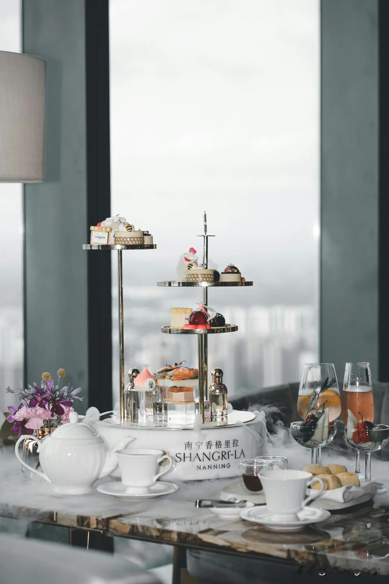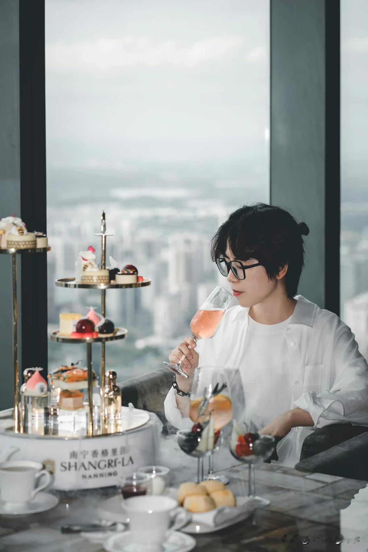 南宁旅行|打卡全球最高香格里拉 南宁👣 南宁慢节奏生活 全球最高的香格里拉🌍我替大家打卡啦😝 主打各种「高空」体验❗️还能看到南宁天际线 都说酒店便是一道风景线 但这里却成为南宁独有的观景台🥳 变幻莫测的天气造就了不一样的景观 时而阳光灿烂,时而云雾缭绕 幸运的还能遇见彩虹🌈 🔸很喜欢酒店的调性,从1楼大堂的浮雕、神象雕塑,再到空中大堂“唱山歌”雕塑群,把壮乡的传统艺术与现代都市的时尚元素巧妙结合~ 🔸这次入住的是65平的豪华阁尊荣大床房,270度开阔视野真的不要太爽了!躺在床上就能欣赏风景~ 🔸68楼大堂吧高空下午茶☕️真的要试试,拍照巨出片!有一种叫仙气飘飘的美感😜喜欢西餐的也可以在这里享用,摆盘很精致,玫瑰花和雪茄造型的甜品真的太爱了 🔸68楼百庆阁中餐厅,主打粤菜和桂菜,试了好几道菜都很满意😋鲜胡椒猪肚炖花胶汤、百庆阁鲍鱼焖饭、红酒爽滑鹅肝、永福罗汉果红烧肉、像生花瓶酥、上汤南瓜花,还有我巨喜欢的龙虾刺身和风生水起🥳 🔸5楼壹茶间,主打手工广式茶点,都是现点现做的,广州的味儿一下子就回来了! 🔸想体验一下夜生活,就来alc% MORE THAN WINE 天际酒吧,有乐队驻唱,有南宁夜景,再来一杯鸡尾酒🍹这样的高空酒吧谁能不爱呢~ 📍南宁香格里拉酒店 🚗距离青秀山、南宁东站仅10多分钟车程