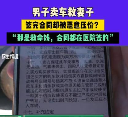 河南郑州,男子的妻子突发脑溢血住院,家里钱不够,他把23万的车卖了175000元,对方给了9万定金后,突然压价,要以166000元收车,男子崩溃:这是救命钱,合同签的17.5万元,是不是看我急需用钱,一直压价钱?汽车公司却说,和男子签合同的不是我们员工,而最终解决方案一出,网友直呼,没良心,不地道! 据河南广播电视台民生频道8月25日报道,河南郑州有位大哥最近经历了一件特别糟心的事,让人看了都替他着急。 大哥的妻子突发脑溢血,情况非常危急,被紧急送进医院抢救。 大家都知道,脑溢血治疗费用可不便宜,一算账,大哥家里的积蓄很快就见底了。 为了凑钱救妻子,他硬着头皮,决定卖掉自己那辆23万买的车。 这辆车跟着大哥好几年了,虽然不是什么豪车,但平时出行方便,可现在大哥顾不上感情了,只希望能快点把车卖掉,换点钱救命。 他联系上一家汽车公司,对方看了车后,开出了17.5万元的收购价。 比大哥心里预期的低一点,但情况紧急,他也没心思再比价,就想着赶紧成交拿到钱。 双方签了合同,汽车公司还付了9万元定金,约好后续交车流程。 大哥心里总算松了口气,想着救命钱总算有着落。 意想不到的事情发生了。 交车结算尾款时,汽车公司突然说,只能按16.6万元收车,要再压价9000元! 大哥听了,整个人都愣住了,随即崩溃:“合同上明明写的是17.5万,怎么说变就变?你们是不是看我急着用钱,故意欺负我?” 后来再仔细一看合同最后面有一行特别小的补充约定:大本三天回来随时可以提档过户,有问题退车款。 买车方拿不到大本不给尾款,卖车大哥拿不到尾款不给大本,这补充约定又写了这么一条。 汽车公司那边解释,说和大哥签合同的不是他们的员工,暗示合同可能不被承认。 这理由让人大跌眼镜:签合同的时候怎么不提前说明,现在翻脸不认账,太离谱了。 这事一传到网上,网友们全炸了锅,纷纷骂公司“没良心”“太不靠谱”。 大家都觉得,人家最危急的时候,不但不帮忙,还耍手段压价,实在令人气愤。 大哥按约定准备交车,汽车公司单方面压价,明显是违约。大哥完全可以通过法律途径维护权益,要求对方按合同付款,或者承担违约赔偿。 最后,收车公司的经理给出了167888元收走了大哥的车。 不管做什么买卖,尤其是大额交易,一定要多留心,把合同条款看清楚,明确双方责任和权益。遇到不公对待,千万别忍气吞声,要用法律保护自己。 信源:河南广播电视台民生频道