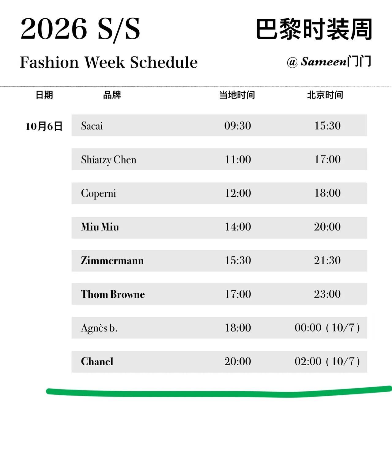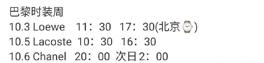 十月是不是也能见到王一博了? 巴黎时装周的时间表来了。 Loewe 10月3日11:30(北京时间17:30) Lacoste 10月5日10:30(北京时间16:30) Chanel 10月6日20:00(北京时间 次日2:00) 9月有赛车比赛,10月有巴黎时装周,按这个节奏来,每个月都能见到一博,好幸福。 珍惜能见到一博的日子。 #王一博#