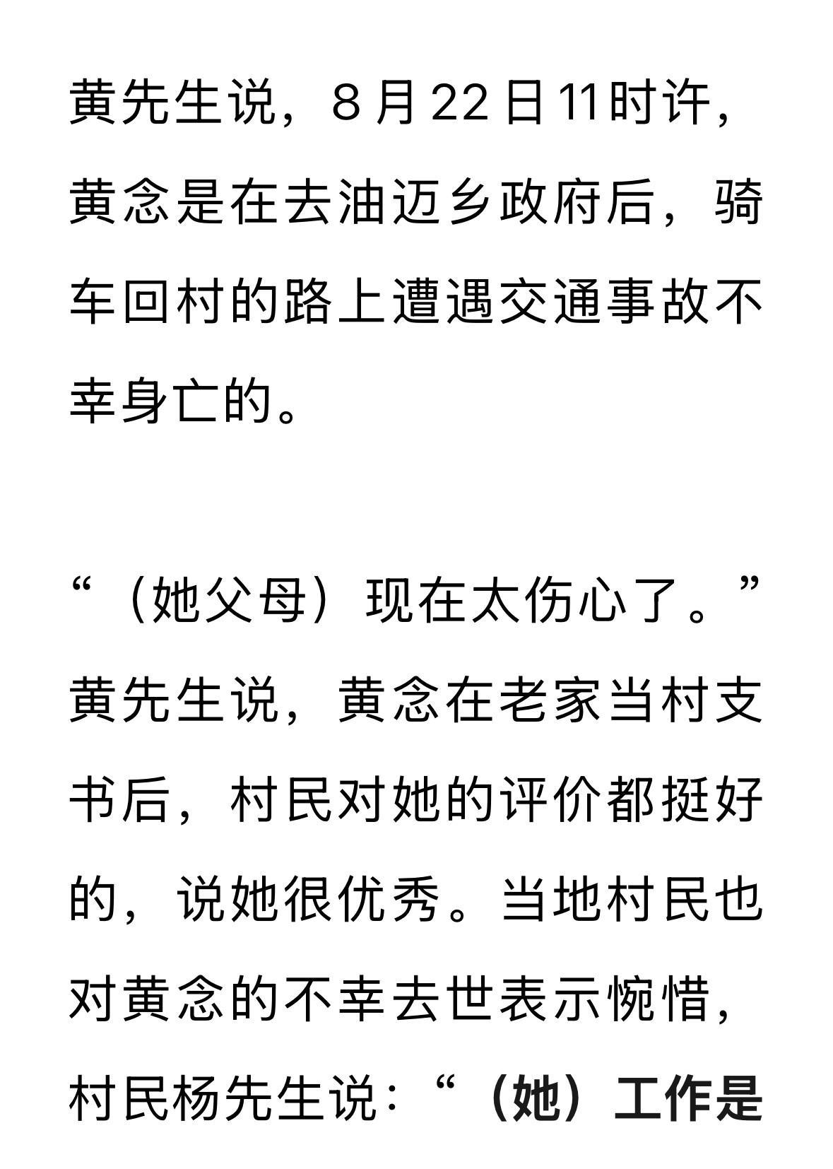 22岁意外去世的女村支书口碑很好,深受当地村民喜爱!她毕业于西北民族大学,刚从学校出来,就留在了家乡担任村支书一职! 哪知工作还未满一年,一场意外就夺走了她的生命。 这个女孩的名字叫黄念,出生于2003年。自小,她跟随父母在浙江长大。 她是个很有想法的女孩,早早的入了党。从西北民族大学毕业后,她留在了家乡黔西南州望谟县油迈乡打寒村,做了一名年轻的驻村书记。 在她生前的几个月工作里,她认真负责,得到了全村人的拥护与肯定。私下里,她更像是小太阳一般,温暖着身边每一个人。 然而,年仅22岁的她在8月22日那天,不幸遭遇车祸离世。最让人痛心的是她的家人都在外地,[流泪][流泪][流泪]连一句话都来不及交代,便离开了! 她还那么年轻啊,正是风华正茂的年纪! 悲剧发生后,全村人都红着眼睛来送了她最后一程。在此,愿她一路走好![祈祷][祈祷][祈祷]