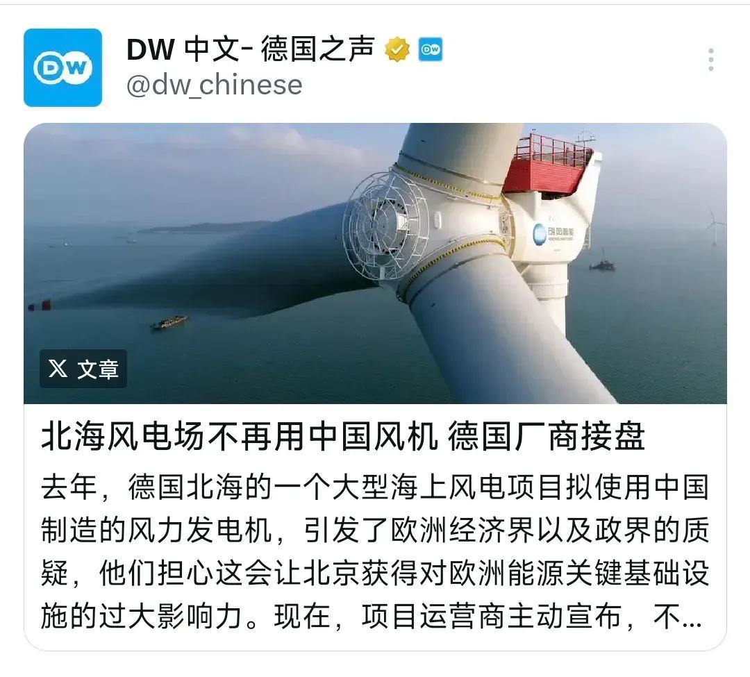 德国之声昨晚(8月26日)报道:“北海风电场不再用中国风机,德国厂商接盘。去年,德国北海的一个大型海上风电项目拟使用中国制造的风电发电机,引发了欧洲经济界及政界质疑,他们担心这会让北京获得对欧洲能源关键基础设施的过大影响力。现在,项目运营商主动宣布,不再采用中国设备,转而交给德国本土厂商。” 刚刚从中国弄走千余吨稀土,也确定了默茨10月份访华日期,德国就开始变脸。其外长访亚洲之行走一路造谣抹黑中国一路,又将一个经过国际化招标风电项目说毀约就毁约,而接手的西门子能源子公司生产的陆上发电机组质量事故频发,屡屡延迟交货周期,当前深陷财务困境。德国北海风电场官方声称,政治争议虽未在公司决策中起决定性作用,但这一举措恰好符合“政治正确”,但不知该厂何时才能发出“政治正确”之电。德国又给我们上演了现实版“农夫和蛇”的故事,不过“月亮走我也走”。