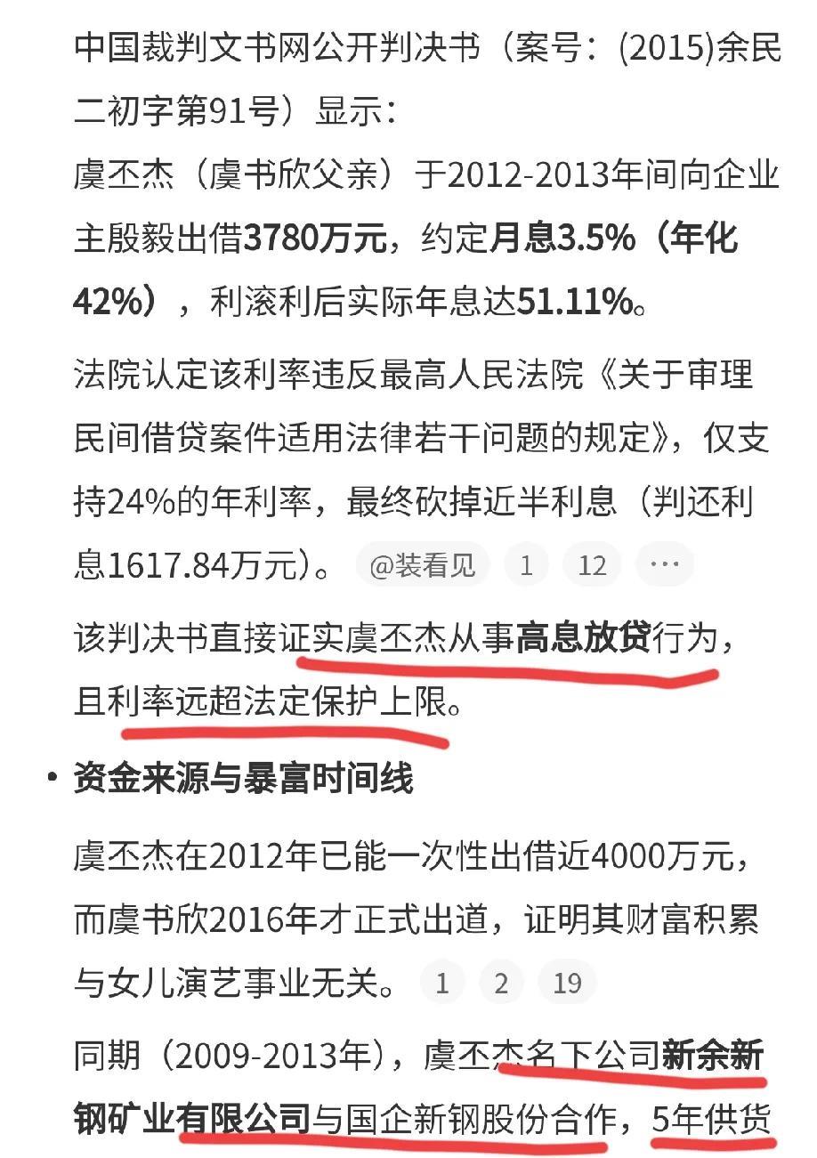 虞书欣是真敢啊,想跟父亲撇清关系。 她不是打造豪门富二代人设吗?什么出生就拥有了多少多少,连王思聪都不放在眼里。 如今说与其父不存在直接商业关联,是不是太晚了? 虞书欣父亲放高利贷且利率远超法定保护上限是事实,先不要说合资公司新钢矿业经不经得起调查,仅凭高利贷这一点她都要退圈的。 所以,还是不要洗了。