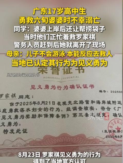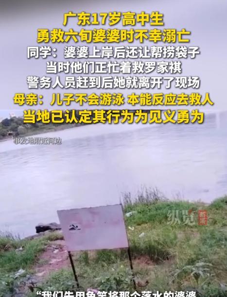 好可惜!广东阳江,17岁高三男生在家附近钓鱼时,意外发现一位老人落水求救,慌张之下男孩忘了自己不会游泳就直接跳下河,怎料老人被顺利救出,而男孩上岸后的样子让人直接泪崩。 据江西旅游广播8月25日报道,“英雄”不只是电影里的超级英雄,也不只是在战场上拯救世界的人。在我们身边,有些普通人,也能用行动诠释真正的勇气。广东阳江的17岁少年罗家祺,就是这样一位让人动容的英雄。 8月21日下午,罗家祺和三个朋友约好去漠阳江钓鱼。 大家一边聊着即将到来的高三生活,一边享受夏日的悠闲时光。 可就在这时,一声凄厉的“救命”叫声打破了宁静。 他们顺着声音望去,发现一位六旬老人掉进河里拼命挣扎,罗家祺来不及多想,也不顾自己不会游泳,没脱鞋,也没拿出新买的手机,就纵身跳进河里,义无反顾地去救人。 他的朋友们也立刻行动,一边呼救,一边找工具救援。 幸运的是,他们找来一根鱼竿,大家齐心合力,把老人拉上了岸。 老人虽然吓坏了,但生命暂时安全。 当朋友们转身去救罗家祺时,情况变得非常危险。 河水湍急,他已经体力不支,鱼竿一次次拉伸却断裂。 无奈之下,朋友拨打了报警电话。 警察和救援人员迅速赶到,但由于水流复杂,搜救难度很大。 直到天黑,他们才找到罗家祺。 但他已经没有了生命迹象,这位17岁的少年,就这样永远离开了人世。 事发当天,老人到河边洗东西不慎滑入水中。 据同行的人说,当时老人上岸后还让他们去捞一个袋子,说里面有非常重要的东西。 当时他们几个正忙着救罗家祺,在警务人员到场后那个老人救离开了现场。 罗家祺刚过17岁生日,本应迎接高三的生活,却为了救人付出了生命。 母亲梁女士悲痛地说:“我儿子根本不会游泳,可他就是出于本能,想都没想就跳下去了。” 8月23日,阳江警方为罗家祺颁发了见义勇为荣誉证书,以表彰他的英勇行为和高尚品德。 罗家祺的事迹引发了社会强烈反响。网友们纷纷留言:“17岁,本该充满无限可能,却为了救人献出生命,这份勇气令人动容。” 还有人说:“你可以顺手救一个人,但你不能倾尽一切去救一个人。君子不立于危墙之下,可以有"举手之劳"的善意,但绝对不能让自己身陷绝地。” 见义勇为固然可贵,但一定要注意自身安全。 遇到危险时,可以先报警、找工具或者呼救他人,避免不必要的伤害。 罗家祺虽然离开了我们,但他的精神永远不会消失。 对此你怎么看? 信源:江西旅游广播