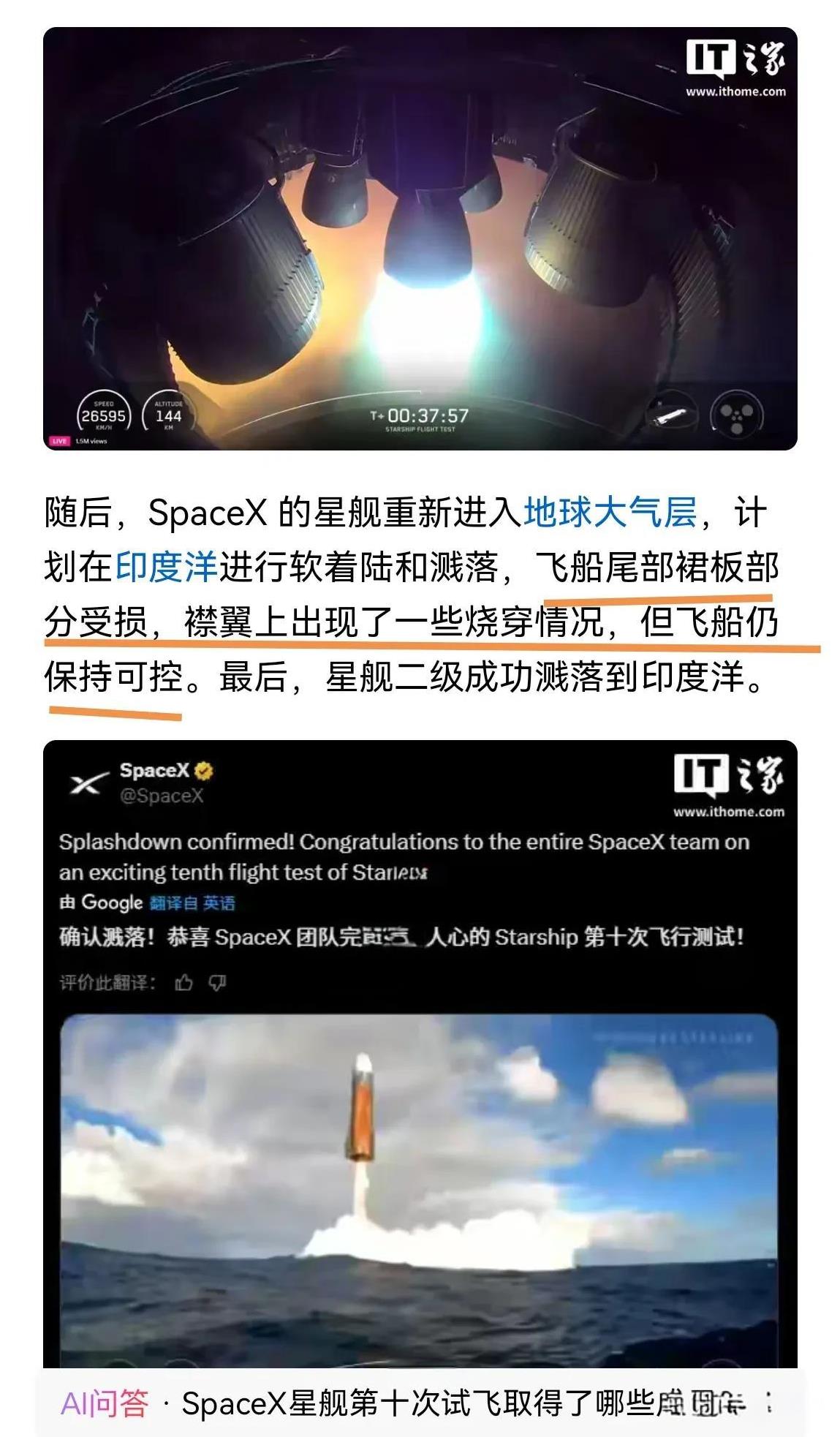 SpaceX星舰十连射,总算成了一回,实属不易,可喜可贺!马斯克可以说是和中国关系最密切的美国企业家,在中国投资办厂造电动汽车,所以对他的成功我们乐见其成。但是有些公知教授极尽赞美之词,跪舔之情溢于言表。查了一下他的简介,大概率又是位文科润美人士。这些人难道不知道这第十次的发射也不近完美。发射升空1分30秒就有一台发动机出现故障;中途有一个二次点火也没成功,返回途中二级火箭局部发生爆炸;襟翼烧穿等等,险情不断。星舰最大的目标之一就是助推器回收,这次干脆就放弃回收,葬身大海了。客观的说,星舰十射九败,这一次也只是完成了布星任务,能算成功,但决不能用完美来形容。完美就没有改进空间了。很显然,离马斯克的目标还差很远。