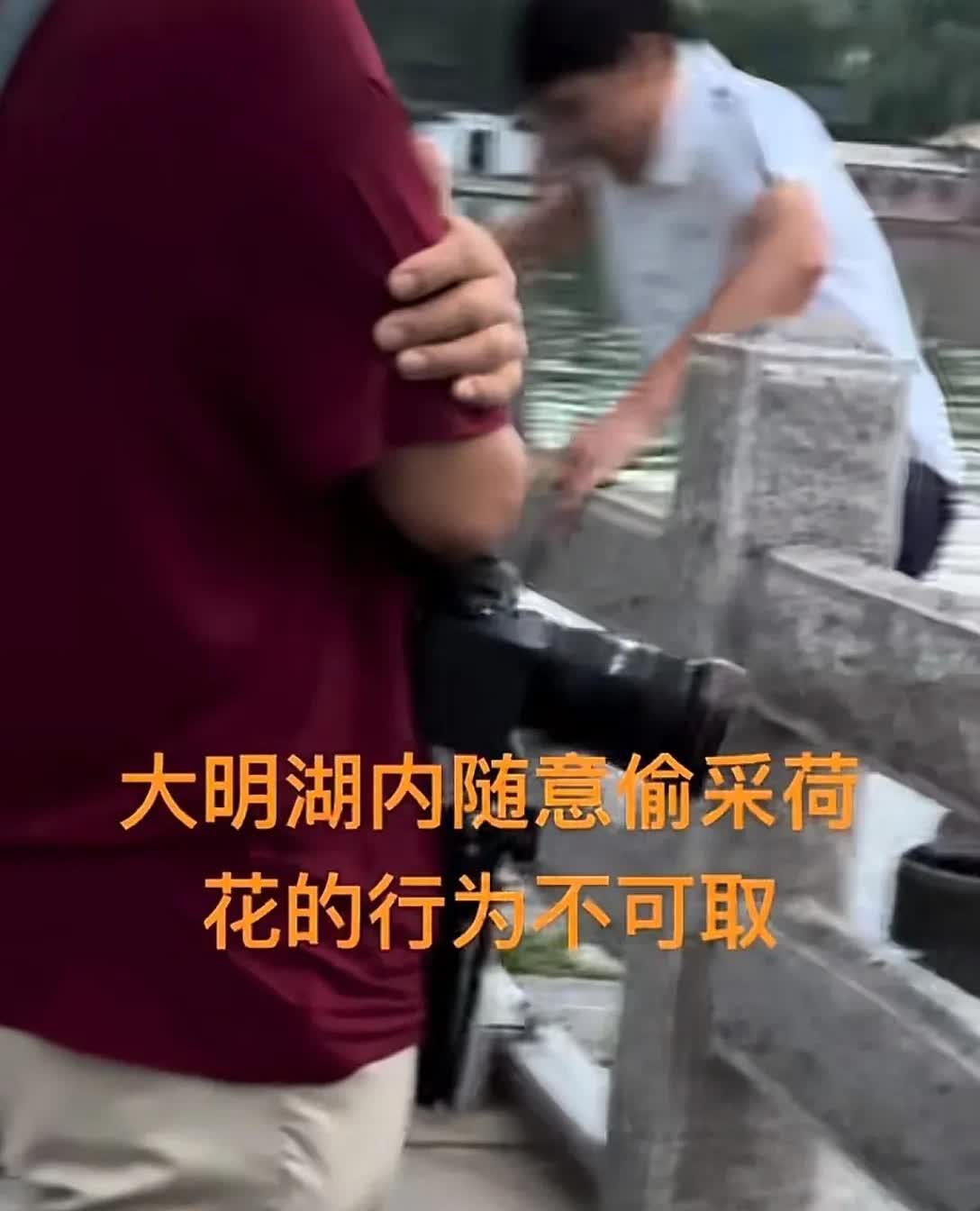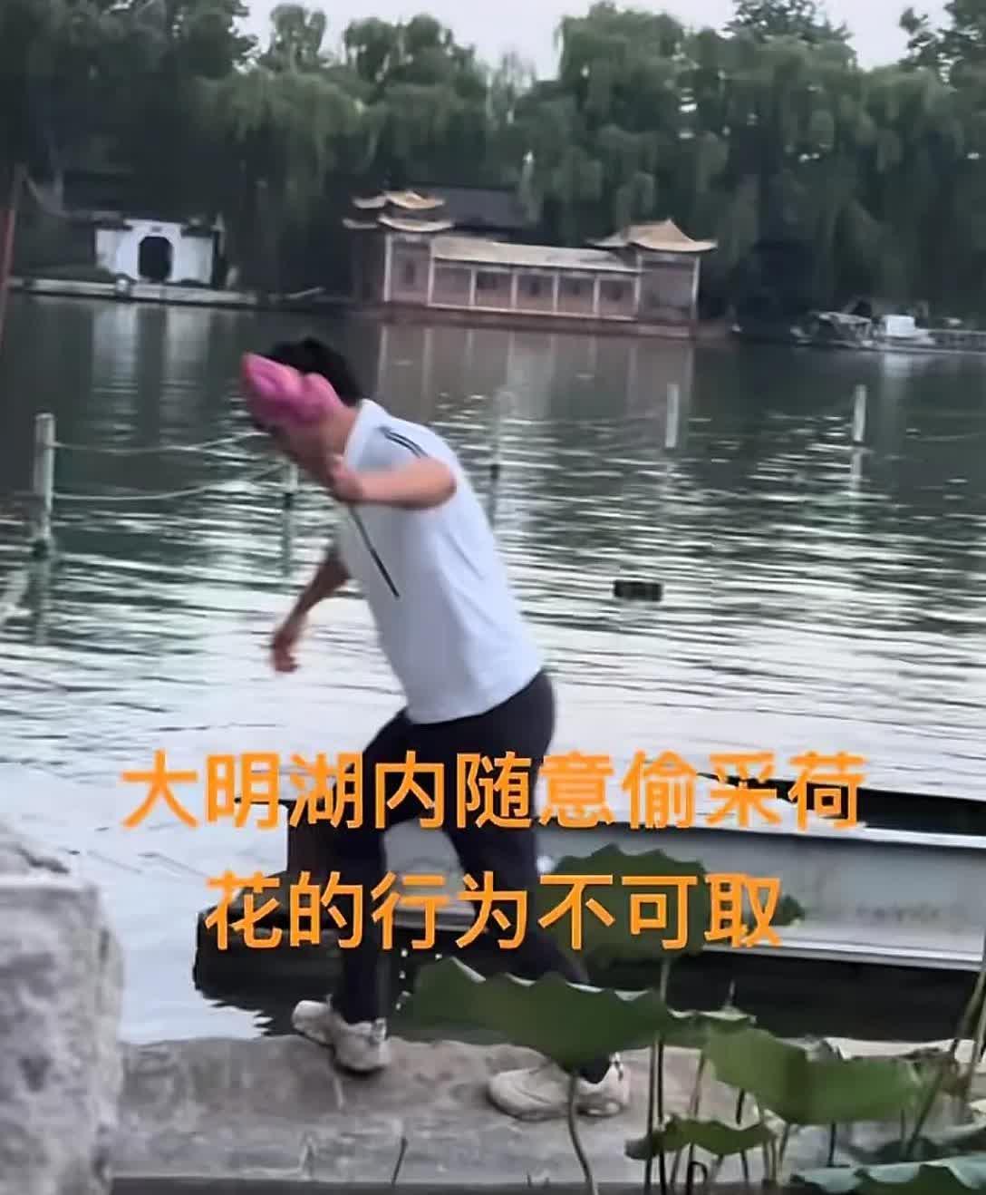 一名男子在游览大明湖时,发现湖中的荷花开的正艳,于是他跨过大明湖的石条护栏,来到荷花池中辣手摧花采摘了两支未开苞的荷花,花头明显还处于含苞待放阶段,看见喜欢的就想据为己有,这属于典型的占便宜没够的,出门不捡点东西都算亏的。如此众目睽睽,跨越护栏本身就不妥,再去辣手摧花野蛮采摘,能干出这事的除了素质低还要脸皮厚,二者缺一不可。男子的行为肯定是违反了游园的相关管理规定,甚至有可能触犯治安管理处罚法,建议对该男子拉入文旅黑名单。