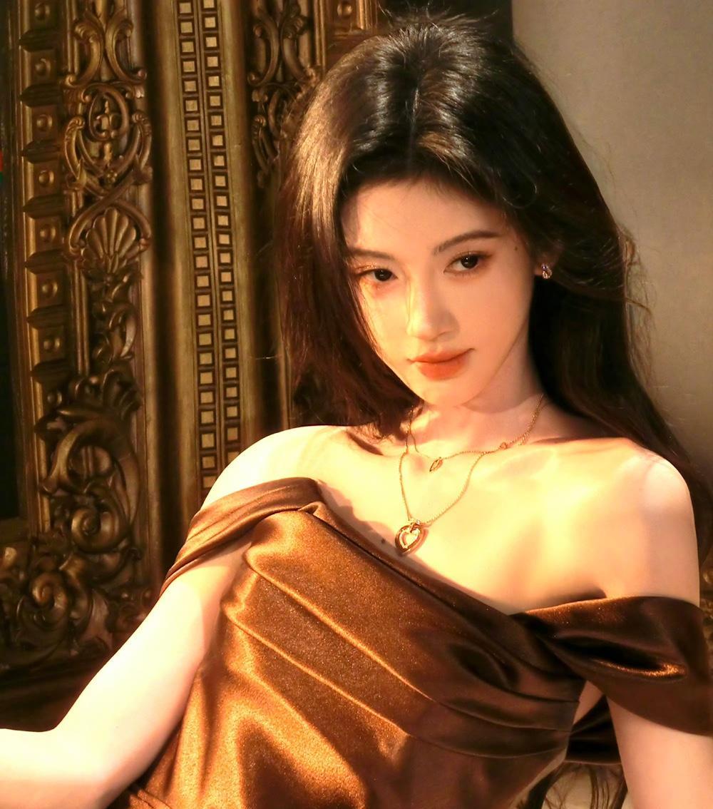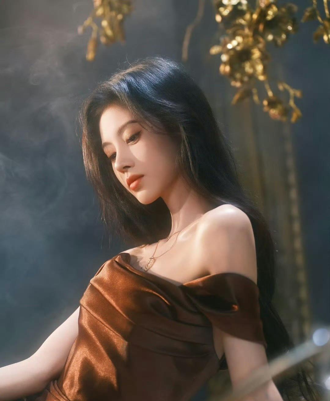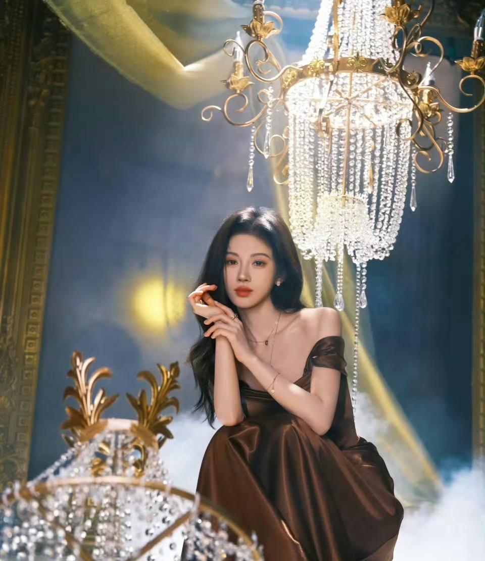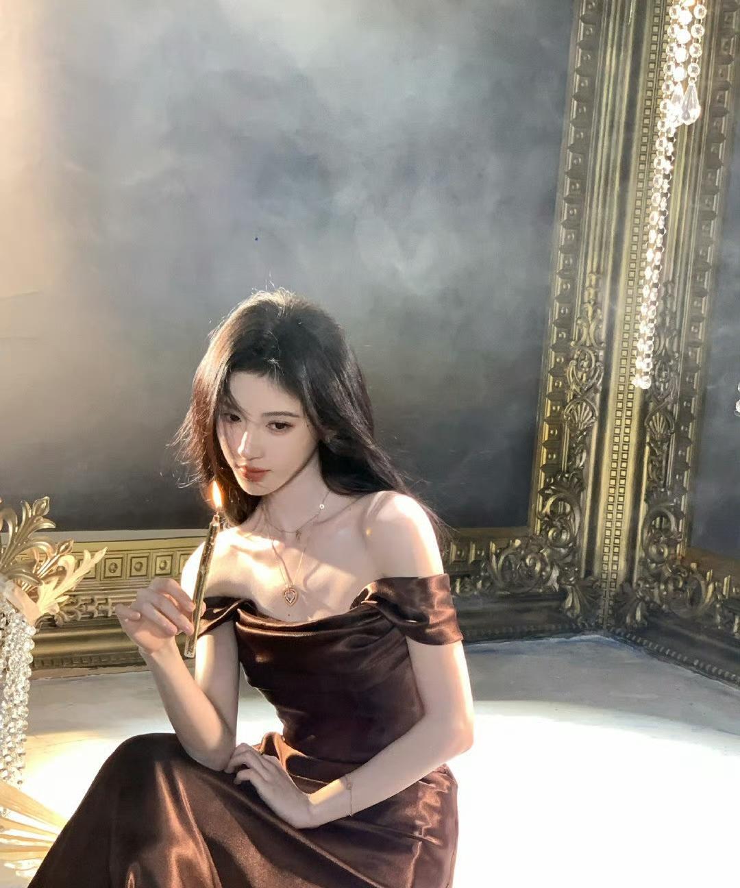 鞠婧祎身穿深棕色缎面一字肩长裙,裸肩剪裁凸显肩颈线条,垂坠感面料勾勒窈窕身型,鎏金色调搭配光影折射出流动质感。