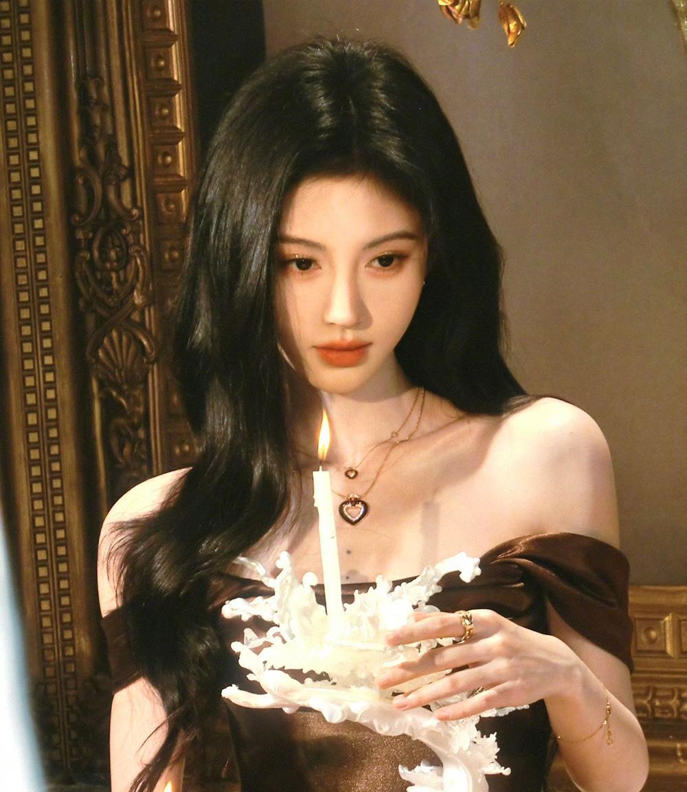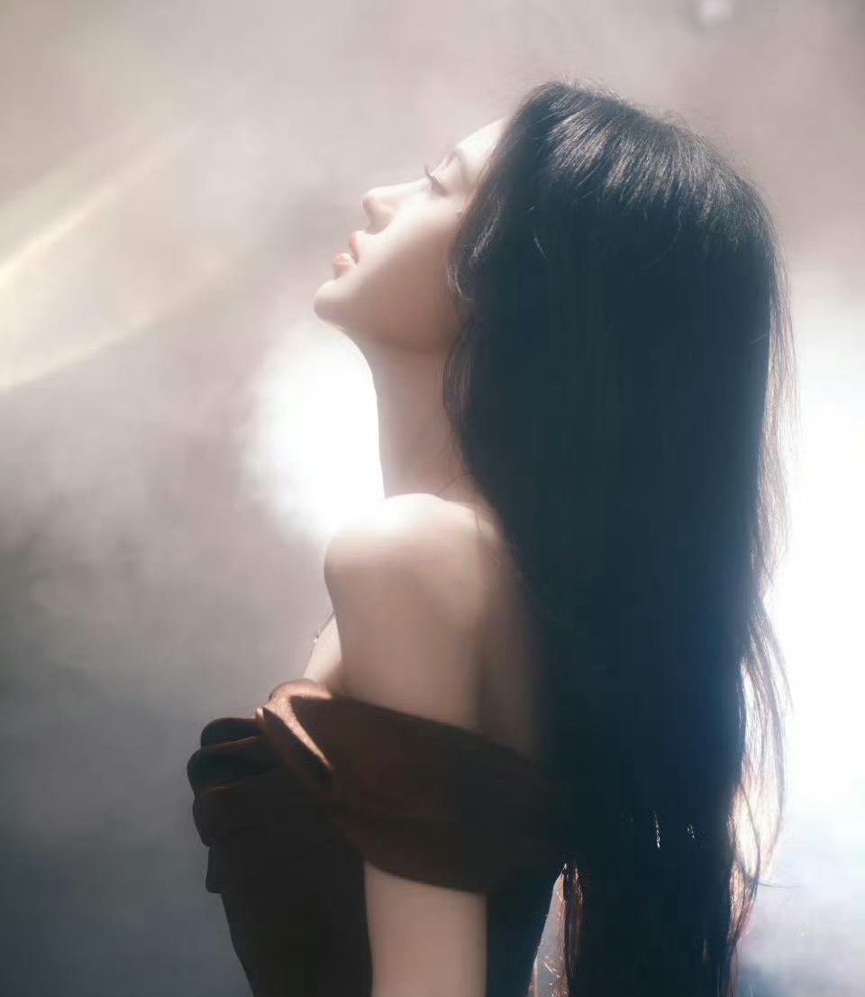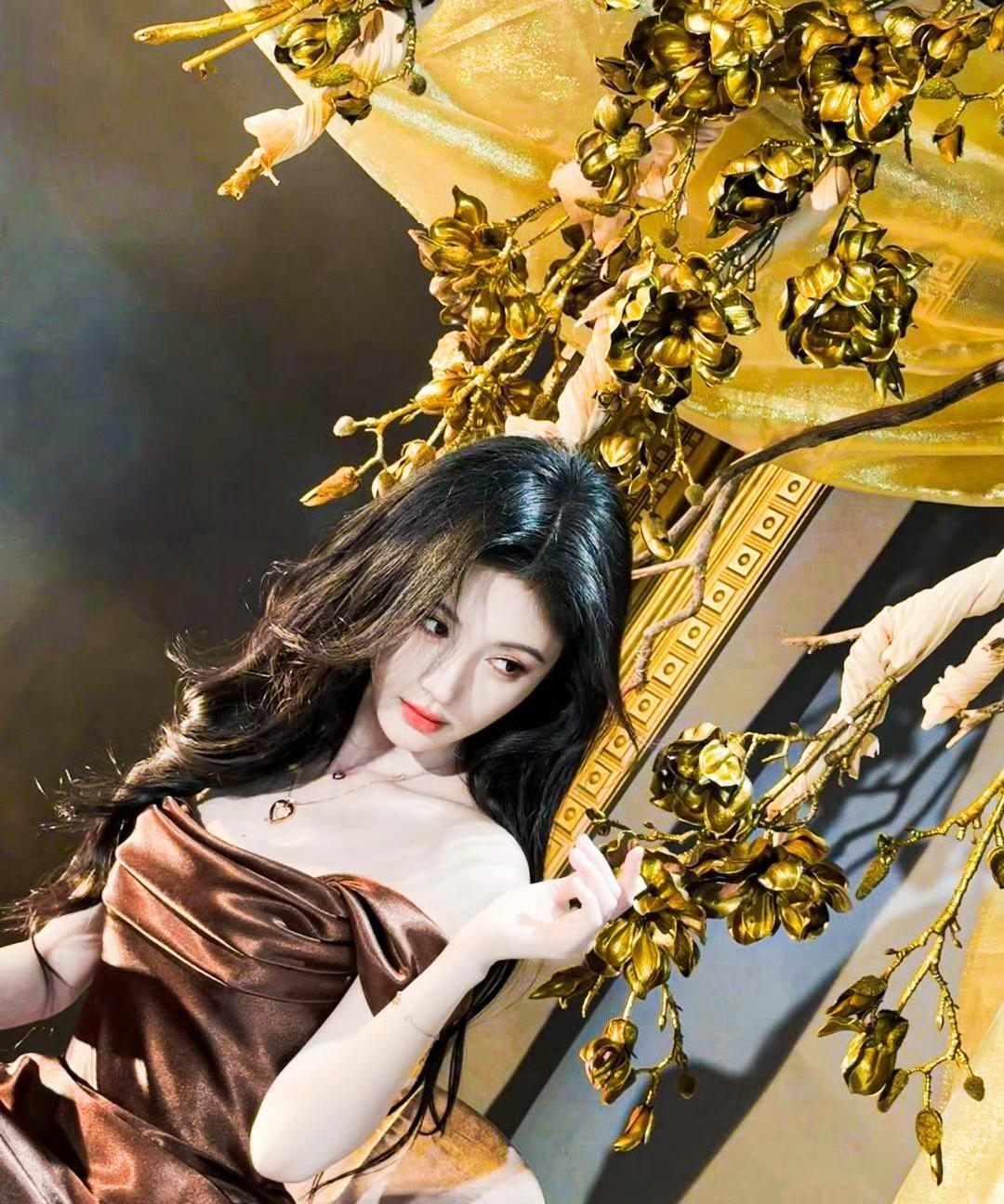 鞠婧祎身穿深棕色缎面一字肩长裙,裸肩剪裁凸显肩颈线条,垂坠感面料勾勒窈窕身型,鎏金色调搭配光影折射出流动质感。