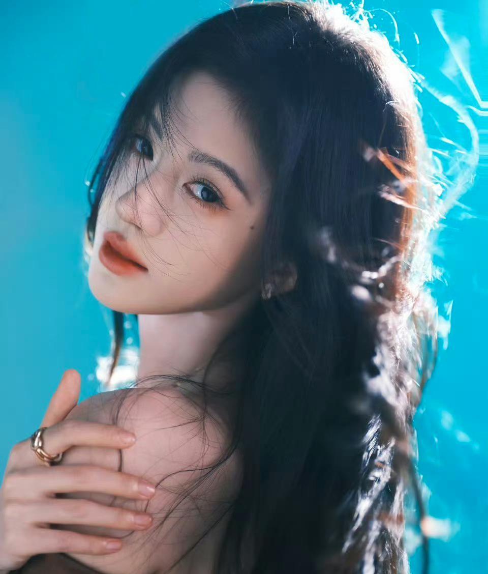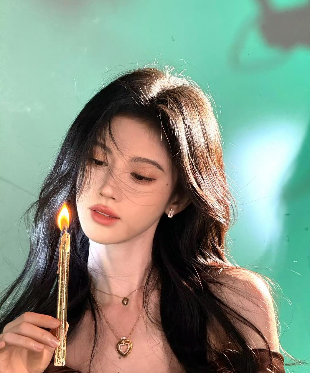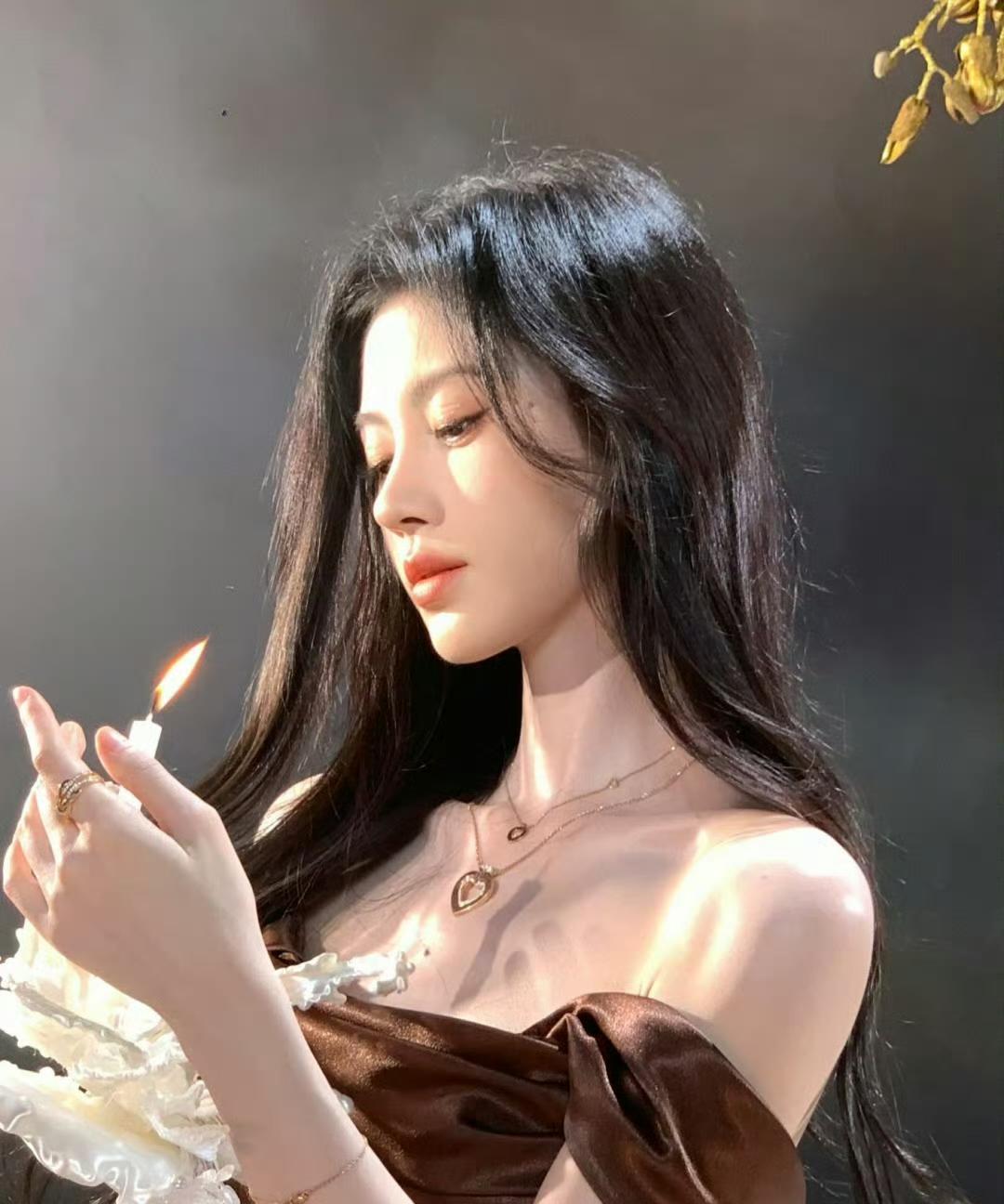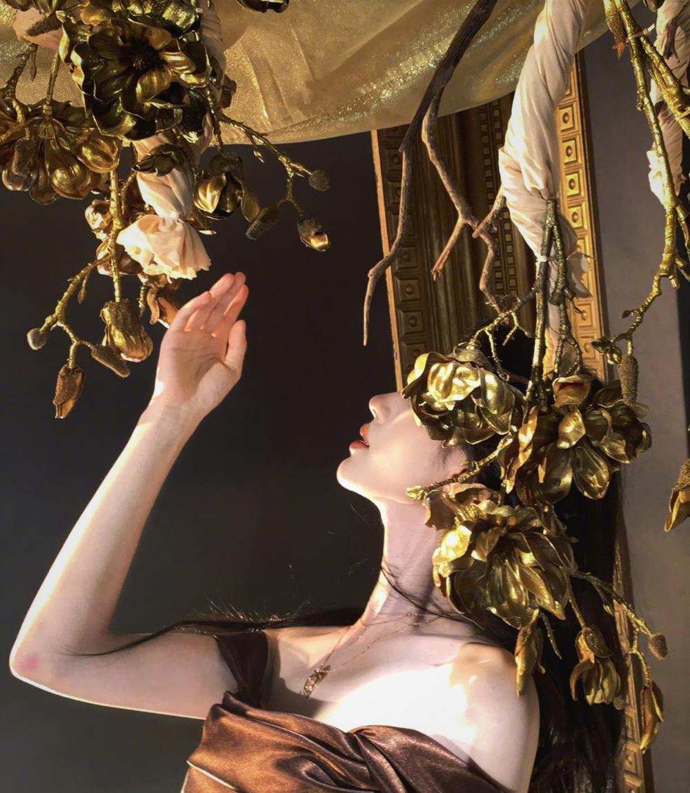 鞠婧祎身穿深棕色缎面一字肩长裙,裸肩剪裁凸显肩颈线条,垂坠感面料勾勒窈窕身型,鎏金色调搭配光影折射出流动质感。