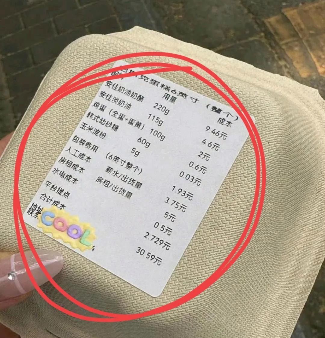 店主好有意思, 把6寸巴斯克小蛋糕的原料、人工、房租这些成本,明明白白全写包装上
