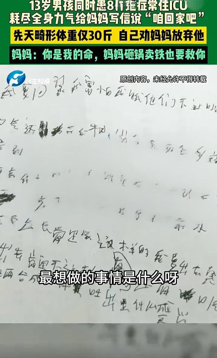 他才13岁啊,他做错了什么?河南商丘一个13岁男孩,他的名字叫福宇,这个名字听起来就很有福气,可他却一点福气都没有,因为他从小就发育畸形,身患肾衰竭、尿毒症、急性胰腺炎、重症感染等8种“绝症”,13岁了体重仅有30斤。 虽然年龄尚小,但小福宇对自己的身体状况其实是心里清楚的,所以他在病房里耗尽全身力气给妈妈写信,“妈妈,咱们把药退了,回家吧”,他想用这种方式来劝说妈妈放弃治疗,因为为了治愈他,他的家庭早已花光了所有费用。 但身为母亲,又怎么忍心放弃自己的孩子,他的妈妈尽管每日以泪洗面,但还是很坚定地告诉福宇,“你就是我的命,妈妈就算倾其所有,无论如何都会救你”。