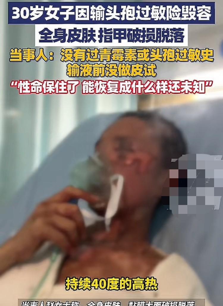 太吓人了!谁能想到一个如此漂亮的女士就因为一个疏忽变成了这个模样! 浙江桐乡,赵女士因病到医院输液,因其以往没有抗生素过敏史,医院在对其注射头孢时就没有进行皮试,谁知挂水后没多久,赵女士就感觉不舒服,当天晚上更是全身发红起水泡,最后医院甚至都要下达病危通知书了!还好,最后赵女士被救过来了,但是这一身皮肤能否恢复就是未知数了…… 很多人有个误区,认为自己以往没有抗生素过敏史,以后就不会对抗生素过敏。实则不然,我们每个人各个时间段自身的免疫系统状态是不一样的,所以很难保证以前不过敏的东西以后也不过敏! 所以,如果大家以后要用到抗生素,千万要先做皮试,没有问题再用药,不然一旦发生过敏反应,后果将会很严重!
