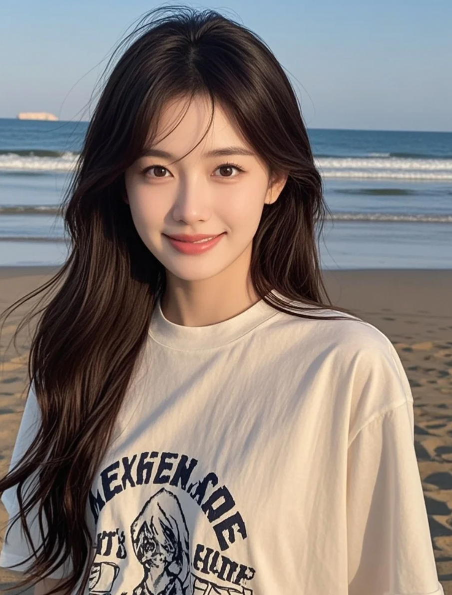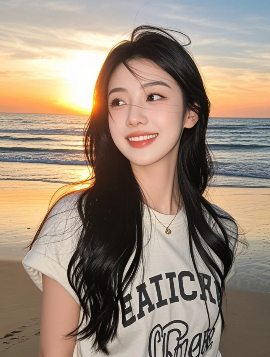 长发女孩在沙滩,晚风轻拂,笑容如花,充满诗意