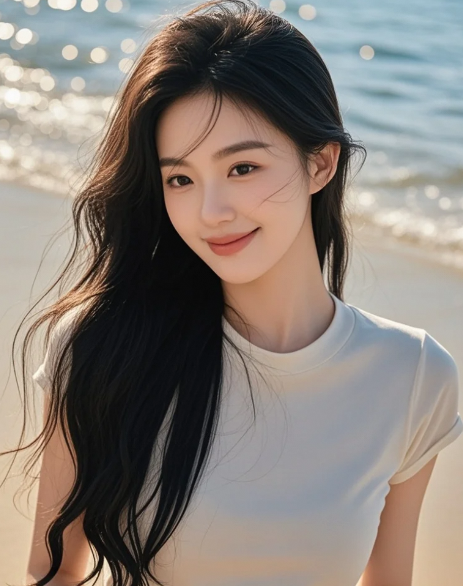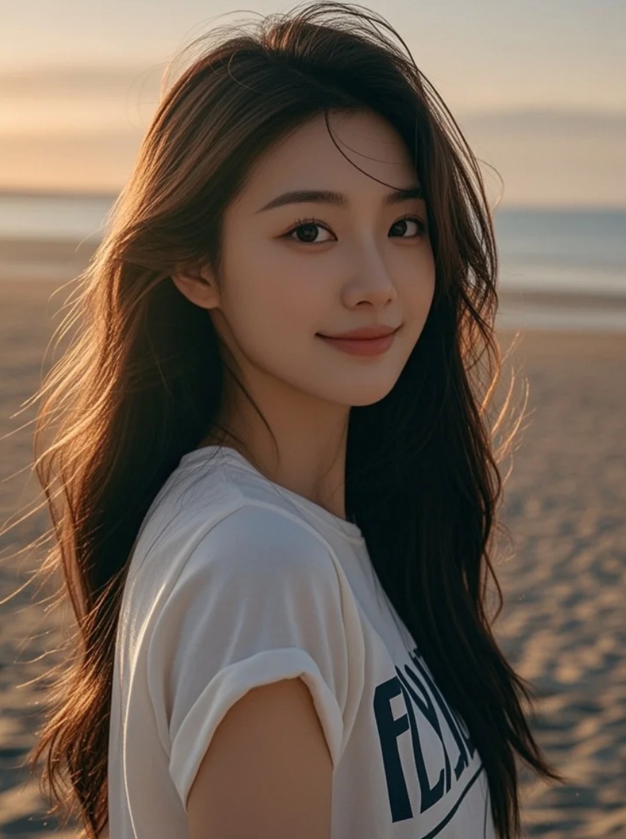 沙滩长发女孩,晚风轻抚,笑容温柔而充满神秘