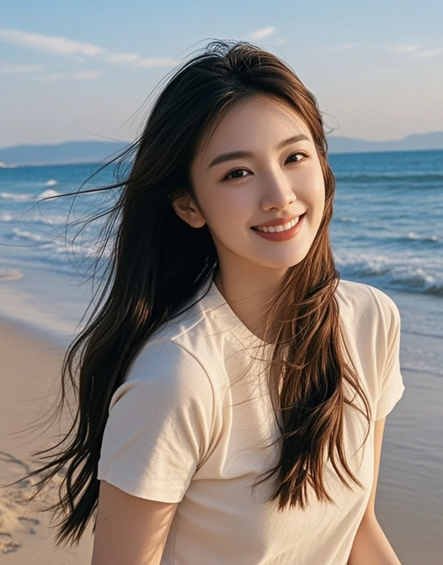 柔和的暮色里,她伫立沙滩,长发与晚风共舞,诗意盎然