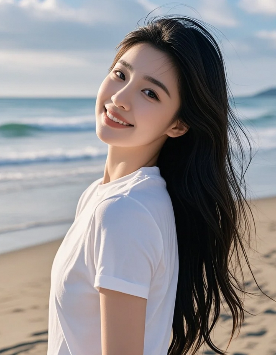 海风轻吻她的面颊,长发飘飘,T恤轻扬,画面浪漫而神秘
