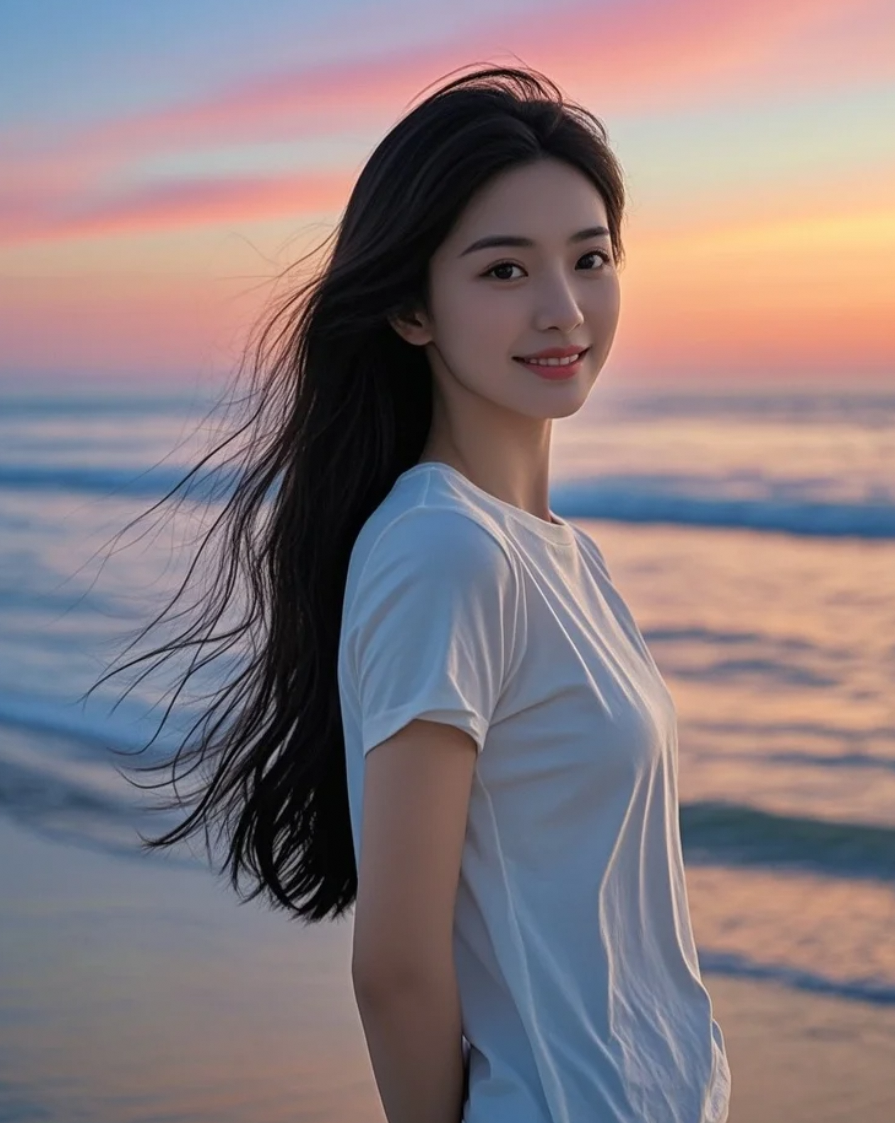 阳光明媚的海岸边,她浅笑盈盈,长发与T恤共谱青春乐章