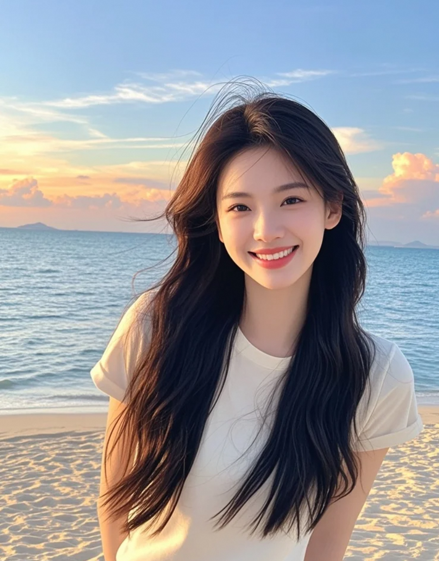 沙滩上的她,被柔和色调包围,长发飘逸,充满艺术诗意