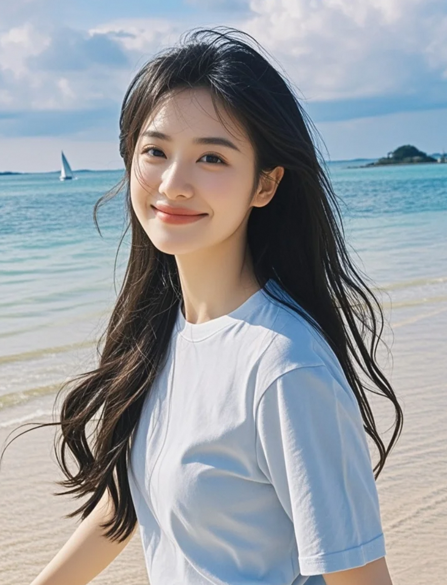 沙滩之上,她身着素雅T恤,长发随晚风轻扬,笑容如晨曦般温柔动人
