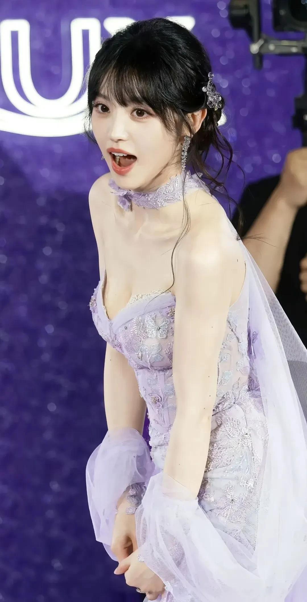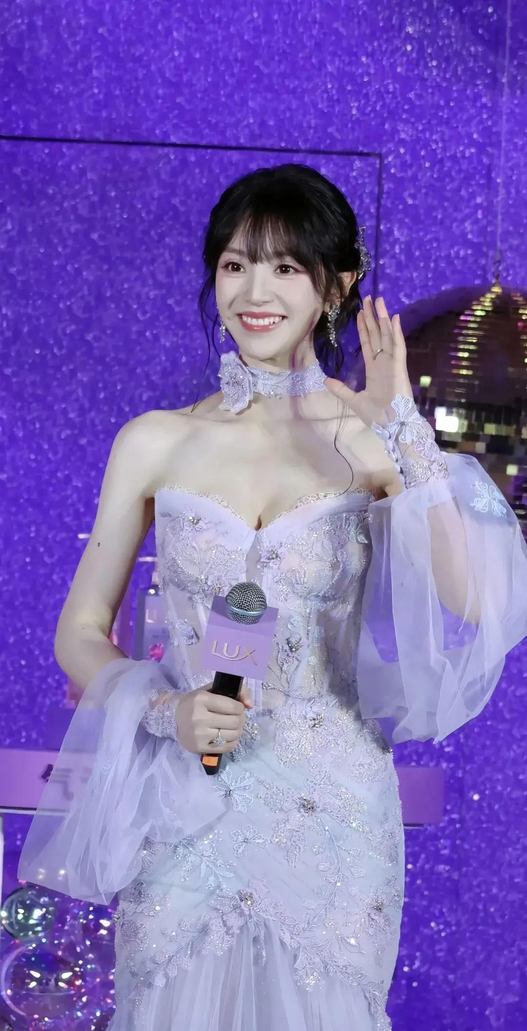 田曦薇穿浅紫蕾丝裙,直角肩、精致锁骨超绝,皮肤嫩到发光,甜笑互动,性感直接杀疯全场!