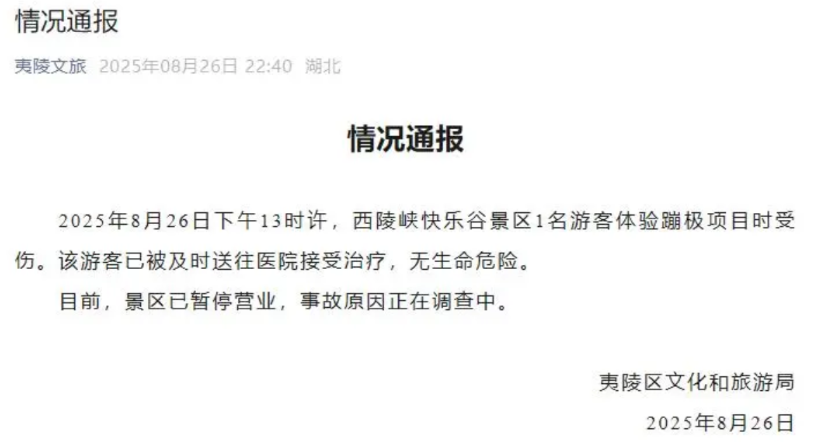 61米高的蹦极台啊!人跳下去先弹了一下没事,再一落,绳子直接断了!水面上鲜血淋漓,让人揪心?8月26号宜昌西陵峡快乐谷这蹦极事故,每个细节都把人的心揪得紧紧的!本来想玩个刺激,结果差点把命搭进去。 游客大腿流着血被抬上担架,目击者都说坠落得有40多米高!最绝的还是,相关单位的操作:景区一边停业检修一边撇清关系,文旅局轻描淡写的表示“人没事,在治”。可咱老百姓想问的是:到底是绳断了、扣松了,还是安全弦先断了?我们一起来看看具体报道! 综合大河报等媒体报道,近日,宜昌西陵峡景区内蹦极绳子疑似断裂,游客掉进水里后被捞起!据目击此次事件发生的小何告诉记者,出事的游客是一名女性,女生蹦下去后第一次反弹上来,绳子没断,然后自然下落,第二次绳子断了,断开的位置在安全绑带和绳子的连接处,人撞到栏杆上摔到水里。 当时,女生躺在平台,哭得撕心裂肺的,大腿更是鲜血淋漓,最后被抬上担架!要知道,这蹦极台可是全国有名的高跳台,230块一张票,卖的就是“专业安全”! 更让人闹心的是景区的“反应速度”!事故一发生,下午3点就发了停业检修通知,转头却跟记者说“检修和事故没关系”。关键是,早不检修晚不检修,偏偏游客坠江当天就“全面维护”,这不是“此地无银三百两”吗? 更让人苦笑的是,官方通报里那句“无生命危险”,听着让人松口气,可细想之下满是后怕。“没生命危险”不代表“没安全隐患”啊!这次是游客命大,摔进水里还能被捞上来,要是下次绳子断得再彻底点,或者坠落位置没那么“幸运”,怎么办?极限运动的安全底线,从来不是“不出人命”,而是“不出任何意外”! 当然,这起事故,不仅关乎受伤游客的安危,更牵扯到整个极限运动行业的信任危机。事件曝光后,西陵峡景区退票量激增,周边民宿退订不断,全国蹦极项目预订量骤降45%。消费者不是不愿追求刺激,而是不敢再把生命安全托付给那些不负责任的景区。 现在事故原因还在调查,可咱们普通游客等不起也耗不起。说到底,这场事故暴露的不只是一根绳子的问题,更是景区安全管理的“漏洞”、应急回应的“敷衍”。别让咱老百姓的游玩热情,凉在一次次“安全失守”里! 毕竟,游客是来寻开心的,不是来玩命的!大家说呢