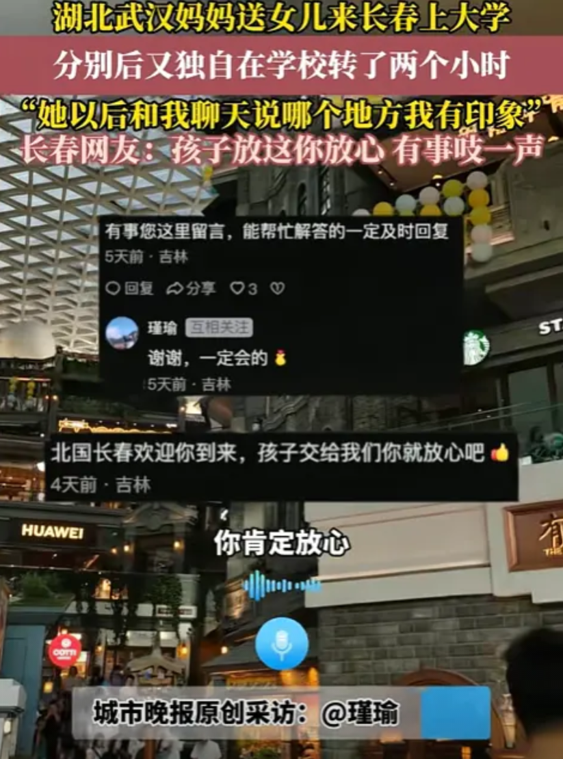 而长春网友的善意更让人暖 —— 陌生人一句 “有事吱一声”,看似简单,却能驱散离别的愁绪。这也说明,不管来自哪里,父母的牵挂都一样,陌生人的善意也能跨千里。
