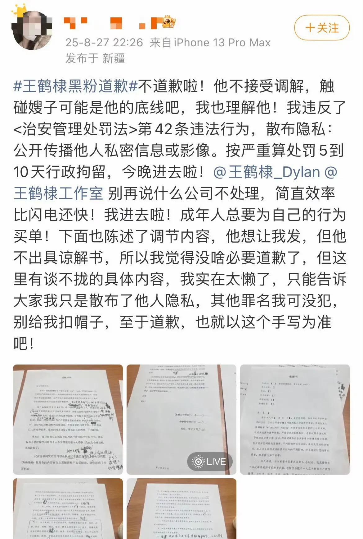 录音王鹤棣的网友发文,听过这个录音感觉真不太像私生,他的私生都知道他女朋友没分一直在身边,这个女的就是太老实了,如果说自己在走廊录视频背景音录到什么,那就没有问题了,这种告侵犯隐私,不是造谣也判不了几天