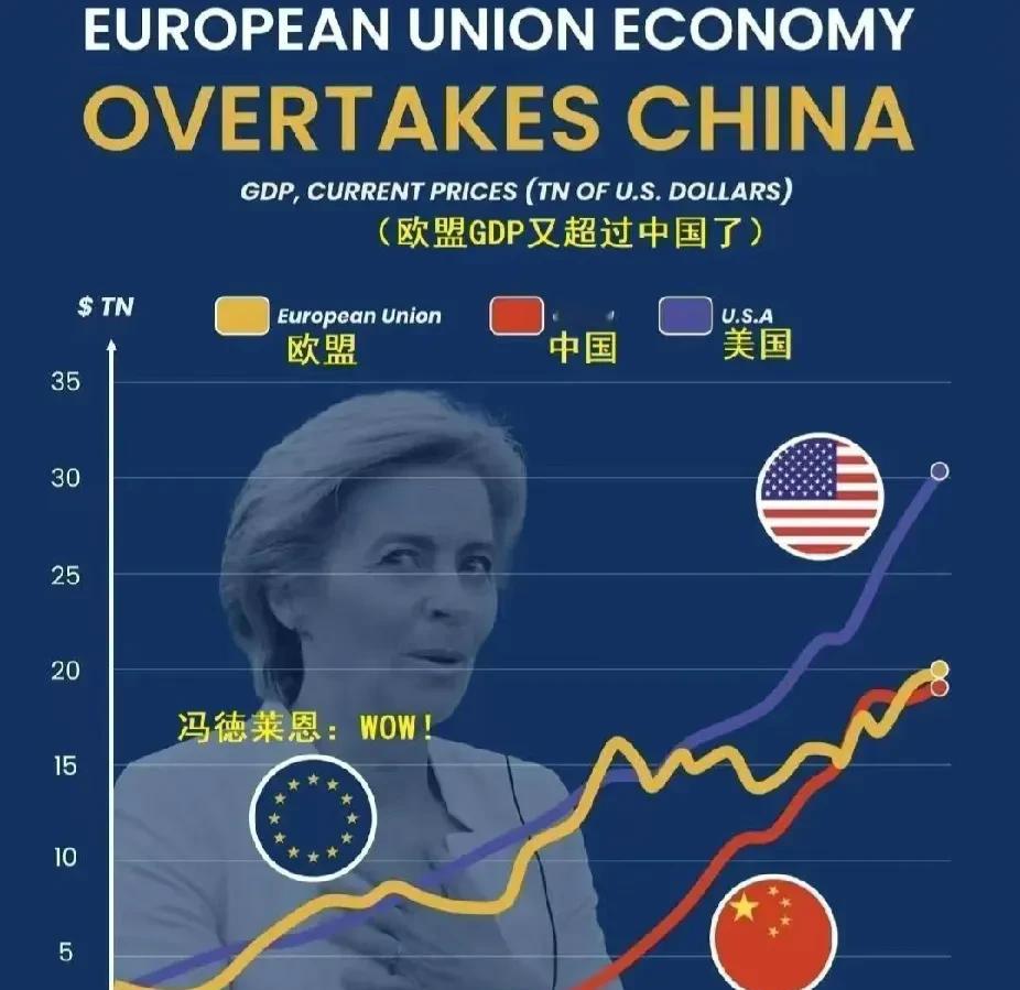 欧洲GDP略超中国,冯德莱恩在媒体上发文祝贺,欧媒也是一片叫好。 8月27号,从香港《南华早报》报道的消息可见,根据IMF最新数据显示,今年欧盟GDP为19.99万亿美元,而中国则是19.23万亿美元,也就是略微超过中国。 冯德莱恩为此松了口气。 有网友认为也就超过这么一点点有啥好高兴的。再说了,欧盟还是这么多国家加起的数据,更没什么可骄傲的。 但实际上欧洲大部分都是些小国家,其中也就几个老牌工业国发达,就比如曾经德国GDP一个国家就远超过我们,这也是最近几年才超越他们,我们也真没必要嘲讽人家。 对于欧盟委员会主席冯德莱恩来说,这个世界第二大经济体系称号,当然也具有一定政治意义。 她之所以松口气,我认为她这并不是主要因为GDP排名,而更应该是与美国贸易战的暂时缓和。 近期欧美达成的贸易协定,也就是欧盟同意购买大量美国的能源军火,以换取美国对欧盟商品征收15%的统一关税,而并非最初威胁的30%。 虽说这个协议被认为是“不平等”,但起码避免了与美国在贸易战中更加激烈的碰撞,这无疑不是她想看到的。 正如冯德莱恩自己说的,该协议虽然不完美但强有力,带来了稳定性。 在发展上,谁都知道过于激烈的关系无疑不利于发展,任何国家更需要稳定的发展。