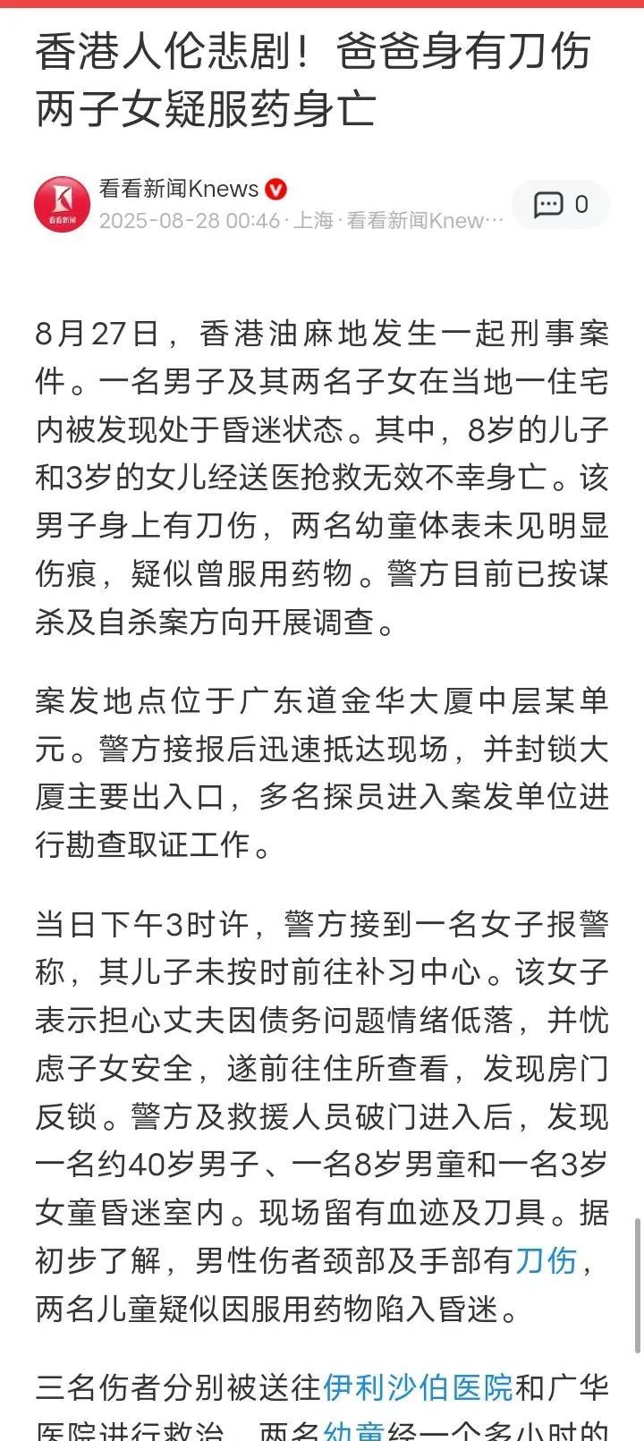 8月27日,香港40岁中年疑因债务问题将8岁和3岁一对儿女喂药后,自己也拿刀自尽。 因当天8岁儿子没有上学,老师联系到孩子的妈妈,妈妈报警,警察破门发现父子三人倒地,父亲身上有血迹,儿女送院后证实不治,而父亲脱离危险。 男子杀死自己儿女,想带着孩子一起走,想必是绝望到了极点[流泪]现在孩子走了,自己却活下来了,这要怎么面对?没有杀妻子,是想给妻子一条活路?香港不是有破产法吗?债务问题实在解决不了,不是可以申请破产吗? 顿顿分享过一句诗“衡门之下可以栖迟,泌之洋洋可以乐饥”,意思是说简陋的房子也可以住,普通的水也可以喝。爱拼才会赢不适合所有人,投资一定要量力而行。 愿两个孩子一路走好[祈祷] #万能生活指南#