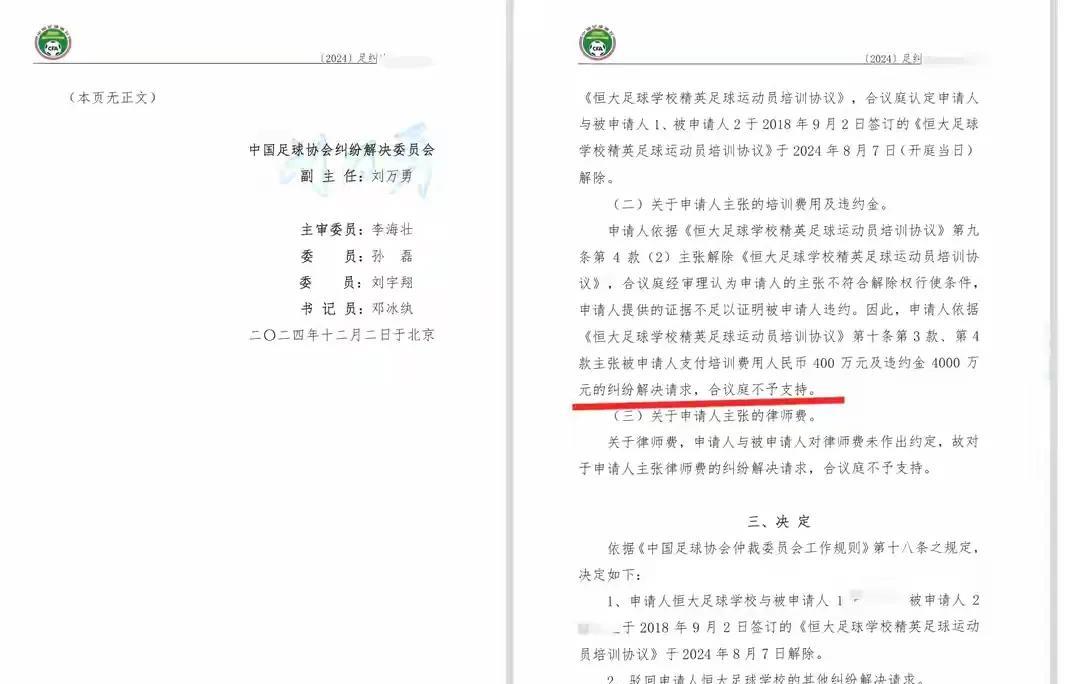 嗨球少年起诉“违约”离队的张卓毅及监护人,诉求要么归队履行合约,要么赔偿266.6666万违约金,这应该是少有的在青少年注册方面,俱乐部或球员通过法律途径解决纠纷的案例。 266万多吗?金额大,但过往走中国足协仲裁的案例中,还有比这个金额大得多的,只是,没有嗨球少年事件这么大的影响力。 2024年12月2日,中国足球协会纠纷解决委员会驳回了恒大足校的一次主张:解除培训协议,要求两年前离队的球员(培训协议签约从2018年9月2日至2025年11月28日至,7年)支付违约金4000万和培训费用400万(依据:培训费100万/年,在恒大足校培训了4年,违约金标准是总培训费的10倍),合计4400万元,另行承担8000元律师费。 中国足协纠纷解决委员会判定双方解除合同,驳回了恒大足校的其他主张(合议庭认为申请人主张不符合解除权行使条件,申请人提供的证据不足以证明被申请人违约)。 嗨球少年起诉张卓毅一案,目前已经倍受关注,这一次判例,必定会成为中国足球青训注册制度的风向标,对完善青训注册制度以及补偿机制,一定会有积极的推动作用。 至于张卓毅目前还没有拿到自由身,无法重新注册,而官司大概率不会很快打完出结果,张卓毅就会被耽误吗? 建立在如果张卓毅自身非常优秀,决心也很强的前提下,这次官司并不会耽误他太多。 他可以到认可他的高水平俱乐部进行训练,如果俱乐部与校园(初中)有双方共建的队伍,他还可以凭借学籍参加一些校园的足球比赛。而明年的中青赛U13,他也有可能能参加(要看具体球队的性质)。 现在,有很多比赛是无需在足协注册的,国内有,国外更多的是。 现在一些青训机构,包括职业俱乐部梯队,在签约注册方面也越来越开明,优秀的球员,可以随俱乐部梯队踢比赛,为将来留下一些可能性。 浙江FC衢州共建,本月赴日本参加了U12世界挑战赛,浙江队的阵容中,就出现了四个球员——位杍瑜(北京梦之队)、马楚尧(大连足协)、曲浩铭(辽宁辽小虎)、康浩(张家口体校),他们目前都没有签约注册在浙江俱乐部,日本U12世界挑战赛也不管你注册在哪里,年龄符合标准就可以。 如果张卓毅努力训练,保持优秀甚至突出,缘分这东西,也可能会降临,他在没有重新注册的情况下也可能获得高水平比赛尤其是外战的机会。