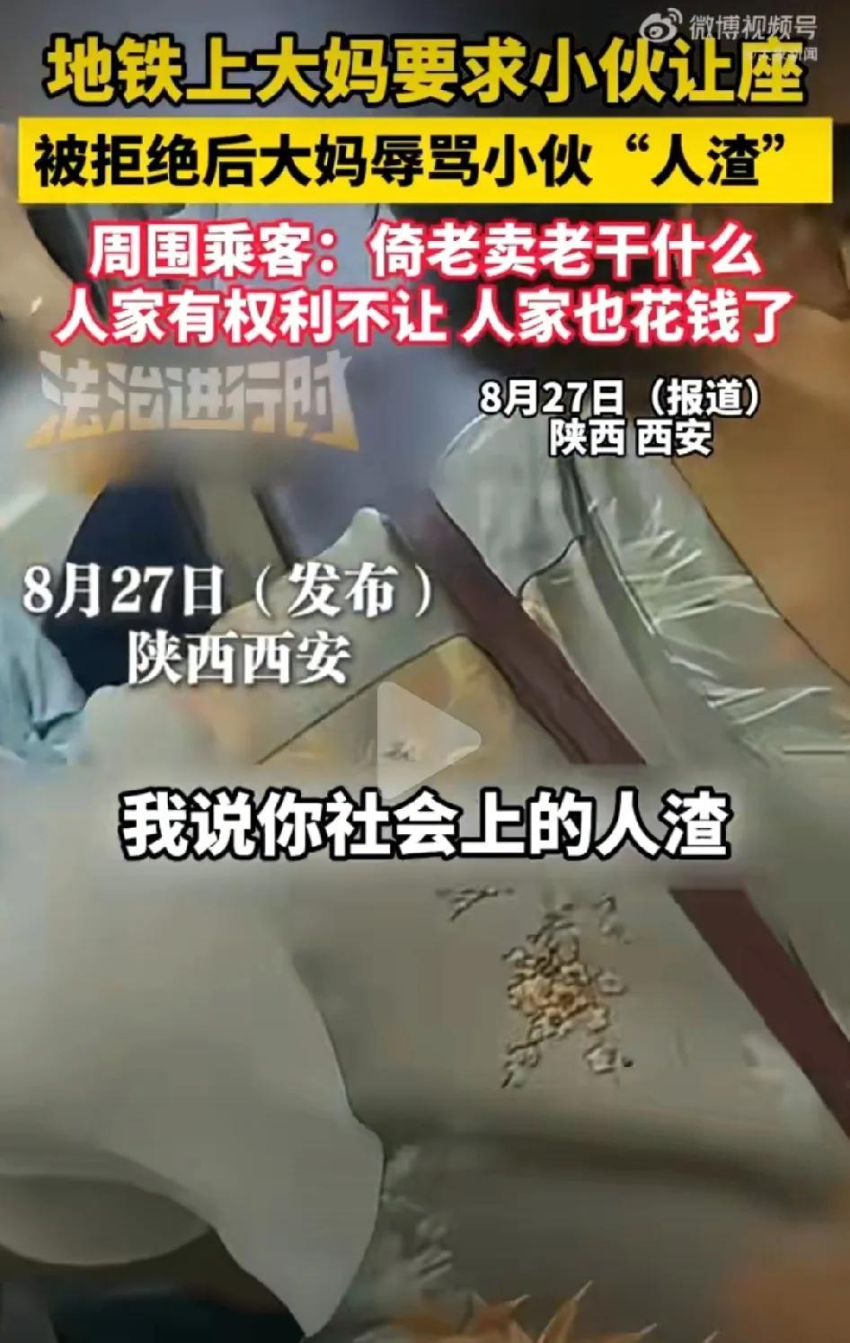 地铁上,大妈要求小伙让座,小伙不小,大妈怒骂:你就是人渣! 西安地铁上,一大妈要