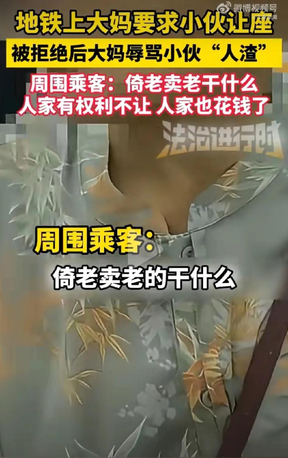 地铁上,大妈要求小伙让座,小伙不小,大妈怒骂:你就是人渣! 西安地铁上,一大妈要求小伙把座位让给她,小伙不同意,于是大妈对着小伙疯狂输出。 大妈:我让你让座,你不让,我说你就是社会上人渣!我说的就是你,怎么了,你还不服?别人不给你爹妈让座,你爹妈不得照样骂他?我就骂你了,怎么的?人渣! 旁边乘客实在看不上去了,有人质问大妈:你倚老卖老是什么意思?人家有权利不让座,人家也是花了钱的。谁规定的必须给你让座? 面对乘客的质问,大妈使出了杀手锏:我心脏不好,就是被你们这些人给气的。你要是给我让座,我会出这事吗? 看看,最后还讹上别人了!真的逆天啊!不知道此人年轻的时候,是不是也像现在这么霸道。如果真是这样,我难以理解她是如何活到现在的。 就事论事,大妈口中所称的“社会上的人渣”,恐怕不是别人,而是她自己吧。