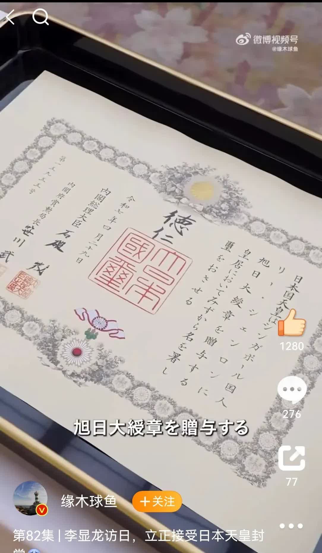 昨天,新加坡前总理李显龙到访日本,日本首相石破茂举行隆重仪式,向李显龙颁发日本天