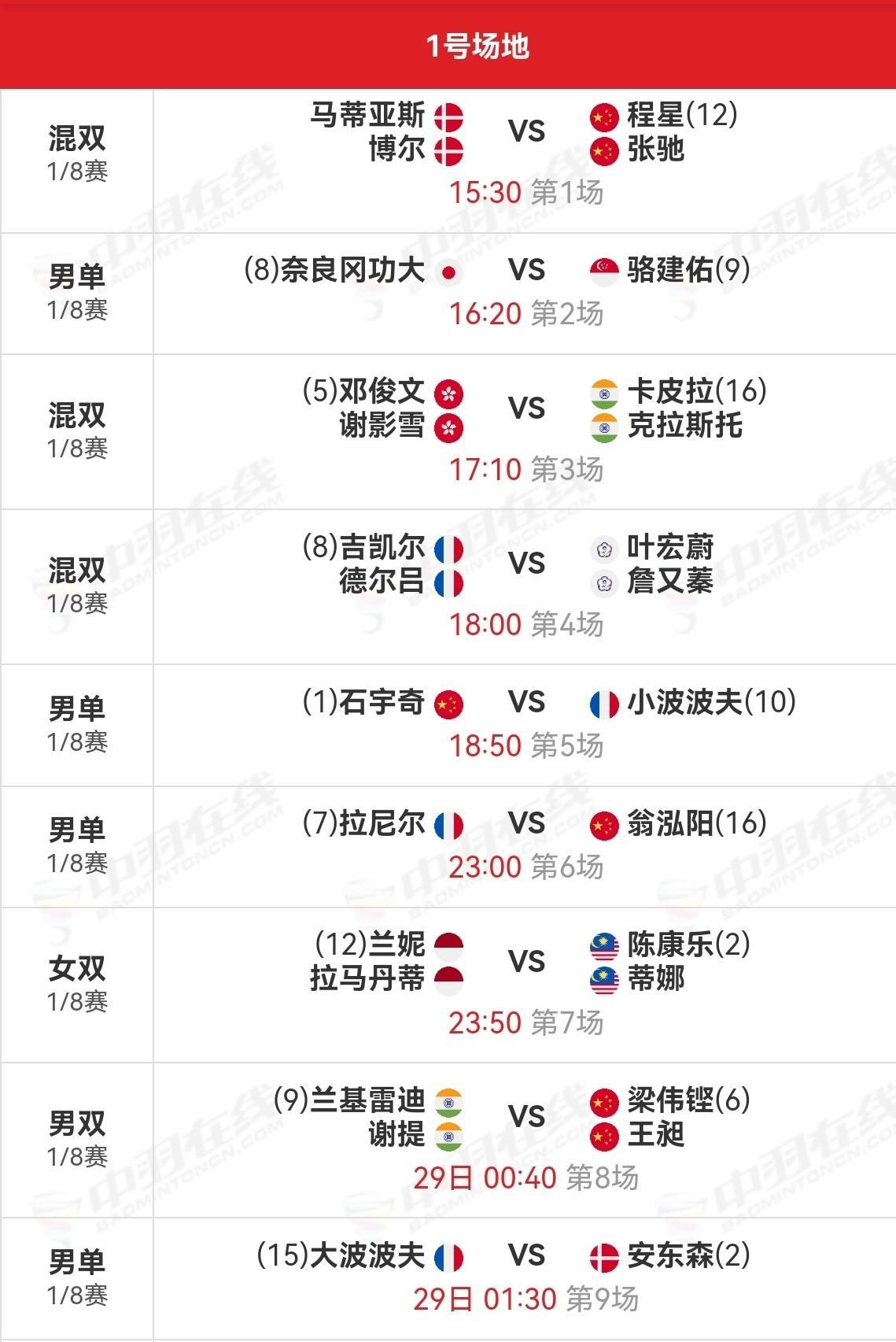 2025年羽毛球世锦赛,27日国羽13战11胜2负,冯彦哲/黄东萍、陆光祖止步。 1/8赛男单石宇奇对阵小波波夫,翁泓阳对阵拉尼尔。 女单陈雨菲对阵阮翠玲,王祉怡对阵辛杜,韩悦对阵高昉洁。 男双梁伟铿/王昶对阵谢提/兰基雷迪,陈柏阳/刘毅对阵克亚尔/索加德。 女双刘圣书/谭宁对阵张净惠/杨景惇,贾一凡/张殊贤对阵许尹鏸/林芝昀,李怡婧/罗徐敏对阵岩永铃/中西贵映。 混双蒋振邦/魏雅欣对阵杰斯帕/艾米丽,郭新娃/陈芳卉对阵杨博轩/胡绫芳,程星/张驰对阵马蒂亚斯/博尔。