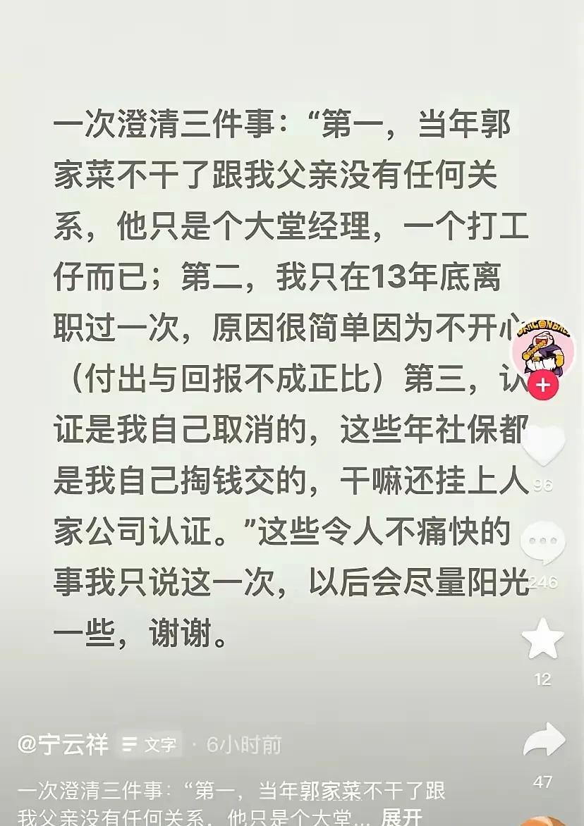德云社,又起风波! 近日,号称“德云四公子”之一的宁云祥通过微博宣布退出德云社。这个宁云祥与德云社渊源颇深,他姥爷是德云社创始人之一的张文顺,2009年宁云祥拜郭德纲为师成为德云社演员。他母亲张德燕还曾在郭家菜当过大堂经理。宁云祥的声明说了三件事,大概意思就是嫌挣钱少,干着不顺心。按理说,宁云祥和老郭关系够铁,按照郭德纲和他姥爷的交情以及德云社的实力来说,如果宁云祥想干,老郭是应该能养着他的。宁云祥如此满腹牢骚地离开,一定是发生了什么,大概率还是因为钱的事儿,否则他不会如此话里有话。之前就有传闻,郭德纲的徒弟要爆料黑他,如今宁云祥的出走是否又会给德云社掀起风波,拭目以待吧!