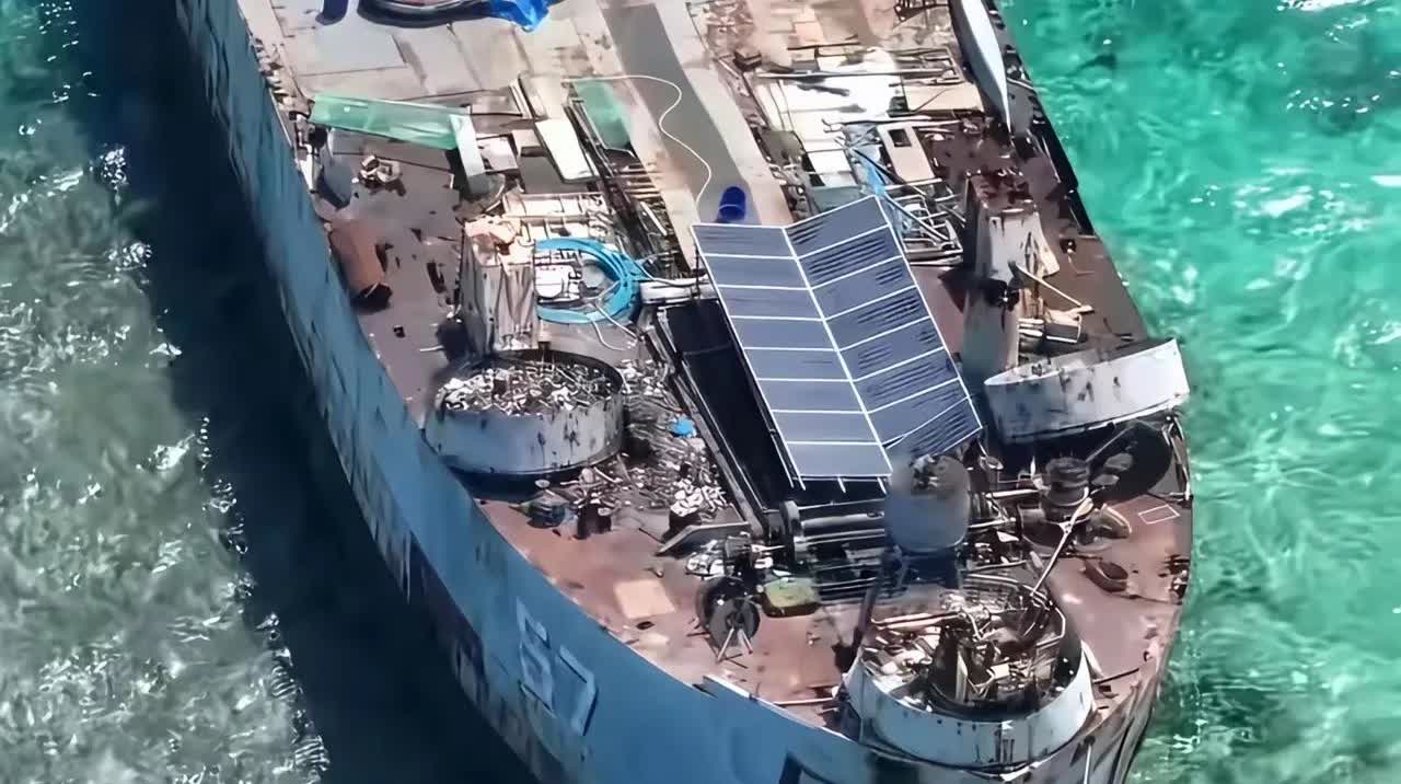 竟然还有太阳能板 ! 网友的建议不孬 白天不间断水炮洗船 晚上弄几艘小艇 装上定向高音喇叭 环绕破船播放喜羊羊[滑稽笑]