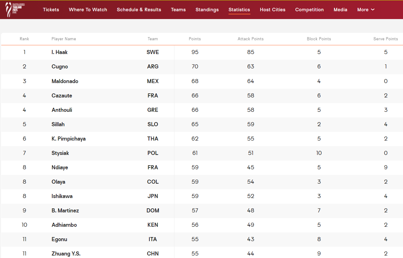 【女排世锦赛小组赛得分王-哈克95分】 2025女排世锦赛小组赛三场战罢 首次代表国家队亮相的瑞典美女接应哈克 三场劲揽95分位列得分榜第1 其中扣球85分+5拦+5发 首战2:3荷兰斩获31拿分 次战0:3泰国轰下25分 末战3:1埃及劲收39分! 国际排联为其专门制作了精美海报 中国女排得分榜排名最高的是庄宇珊 与埃格努同拿55分并列第11名 其中扣球44分+9拦+2发