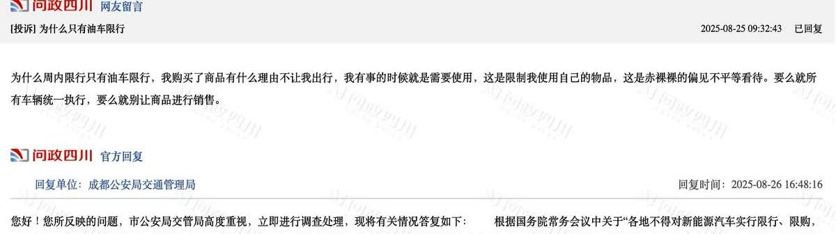 600万辆私家车全国第一,油车天天被限行,电车却畅通无阻,成都车主炸了! 有人把疑问甩给官方:凭啥只限油车? 成都交管很快回话:新能源车目前不在尾号限行范围。 答复后面还跟了一句:是否把电车也拉进限行,会研究。 听上去像官话,其实藏着三个信号。 第一,电车数量还在爬坡,真堵到受不了,政策随时掉头。 第二,现在买电车等于拿一张限时通行证,窗口期可能只剩两三年。 第三,成都的车位、电桩、道路资源都在加速吃紧,不限行不等于永远优待。 手里的油车还能撑多久? 电车红利会不会一夜收回? 答案没人打包票。 唯一能确定的是,下一个政策落锤前,早做决定的人总比晚动的人少交学费。