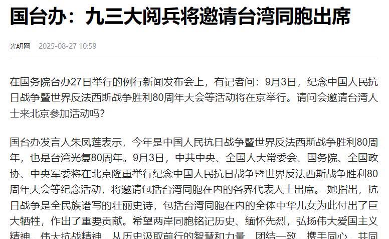 蒋万安可以参加“九三阅兵“,他要是参加了,将会成为东方大国正史里的历史人物,其影响度可能超过马英九等人,因为他是蒋介石的后人,也再一次彰显国共可以为和平发展而合作的。 这次“九三阅兵”可不是普通活动,是为了纪念中国人民抗日战争暨世界反法西斯战争胜利80周年,还有台湾光复80周年。对两岸来说,这日子分量特别重,既要记住过去的历史,也得盼着未来能一直安安稳稳的。 蒋万安要是去了,真不是凑个热闹、走个过场那么简单。他往那儿一站,就能代表年轻一代的国民党人,让大家看到两岸还能找新的和平路子走。甚至能让更多人,尤其是台湾的年轻人,好好琢磨琢磨:咱们民族的未来在哪儿?两岸关系到底该往哪儿走? 而且国台办8月27日已经把话挑明了,明确说愿意邀请台湾同胞去参加九三阅兵。这话其实就是给蒋万安吃了颗定心丸,能打消他心里可能有的顾虑。 毕竟之前他说不定会琢磨:大陆这边是不是有啥别的想法?现在国台办把态度摆得这么清楚,只要他自己下定决心,就能顺顺利利来参加,没啥阻碍。 不过蒋万安要做这个决定,估计也挺难的。民进党当局那边已经放话了,不愿意让台湾的公职人员去参加九三阅兵。他们心里那点小算盘谁不清楚?就是怕台湾民众去了之后,更认同国家统一,打乱他们搞“台独”的计划。 所以蒋万安要是真敢来大陆参加阅兵,不光得自己想透彻、拿定主意,还得顶住民进党可能搞的那些政治压力。 但反过来想,要是他真能冲破这些阻力,站到阅兵现场,那对打破民进党那套“台独”说法,作用可太大了,这等于直接戳破他们的谎言。 再说说蒋万安本人,他以前也常提,说要推进两岸和平交流。要是这次能去参观阅兵,就是把嘴上说的落到实处,让大家看到他是真的想推动和平,不是光说不练。 到时候,他说不定能成推动两岸和平发展的代表人物,不管是大陆民众、台湾民众,还是海外华人,都会更认可他。 这么一来,他不光能在两岸的历史上留下自己的名字,还能给两岸一起创造和平未来,多添一份实实在在的希望。