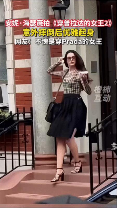 奢侈品的质量都这么差吗? 安妮海瑟薇拍摄《穿普拉达的女王2》,下台阶的时候意外摔