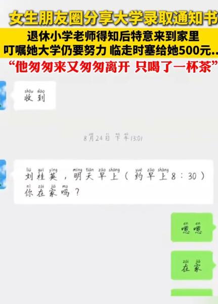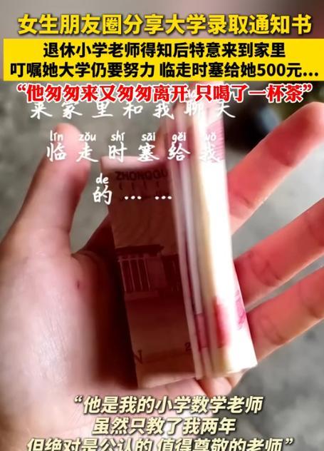 近日,山西朔州,一名退休教师无意间发现,一位曾经教过的女孩今年考上了大学,她在朋友圈分享了录取通知书。他担心女孩考上了大学就止步于此,就和女孩约定去她家一趟。 在山西朔州的一个安静小乡村,退休教师老方的日子平静又悠闲。 那天,老方像往常一样刷朋友圈,突然看到一张大学录取通知书的照片。 照片里笑得灿烂的女孩,正是他多年前教过的学生刘桂英。 看着她的笑脸,老方的思绪一下子回到很多年前。 如今看到她考上大学,老方既欣慰,又有些担忧。 他清楚农村孩子上大学的不易,也明白考上大学后,很多人会把这当终点,他不希望刘桂英也这样。 于是,老方给刘桂英发了条信息,说想去她家看看。 刘桂英既惊讶又高兴,连忙答应。 第二天一大早,老方收拾好东西出发。从镇上到刘桂英家所在的村子,路程不短,他换了几趟车,颠簸了一路。 终于到达刘桂英家,刘桂英早早站在门口迎接。 老方笑着走进屋子,打量着这个充满生活气息的农家小院,感慨道:“桂英,都长这么大了,还考上大学,老师真为你高兴!” 坐下后,老方表情变得认真起来:“桂英啊,老师今天来,是想告诉你,考上大学只是开始,可别觉得可以放松。大学学习任务更重,竞争也更激烈,你要继续努力,将来有机会的话,还可以考研呢,路还长着呢!”刘桂英认真地点头,她没想到毕业多年,老师还如此关心自己的学业。 走之前,老方从兜里掏出500块钱,递给刘桂英:“拿着,买点学习用品,有困难一定要告诉老师。” 刘桂英推辞,她知道陈老师退休金不多,生活也不宽裕。 但老方坚持把钱递到她手里:“拿着,这是老师的一点心意。” 回家后,刘桂英在社交平台分享了和老方的故事,她写道:“真的很感动,没想到小学老师还记得我,还专门跑这么远来家里叮嘱我。” 这条动态很快收获了许多点赞和评论,网友纷纷感叹:“老师太有责任心了,退休了还惦记学生”“500元虽不多,但这份心意太珍贵了”。 对此你怎么看? 信源:沸闻天下