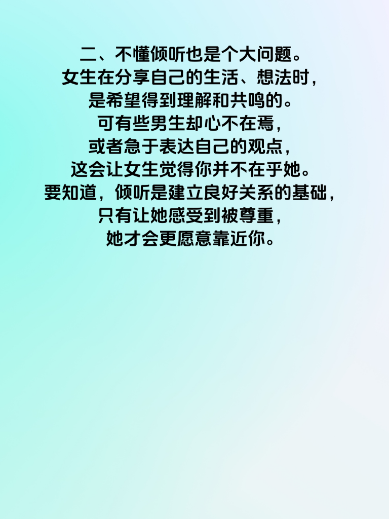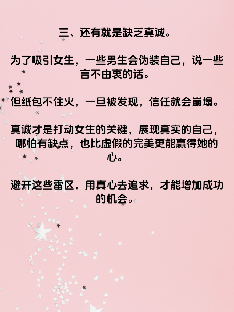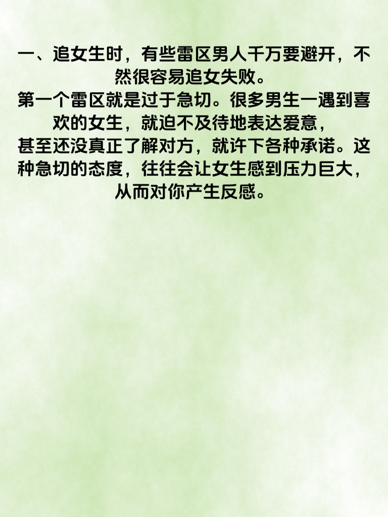 一、追女生时,有些雷区男人千万要避开,不然很容易追女失败。第一个雷区就是过于急切。很多男生一遇到喜欢的女生,就迫不及待地表达爱意,甚至还没真正了解对方,就许下各种承诺。这种急切的态度,往往会让女生感到压力巨大,从而对你产生反感。 二、不懂倾听也是个大问题。女生在分享自己的生活、想法时,是希望得到理解和共鸣的。可有些男生却心不在焉,或者急于表达自己的观点,这会让女生觉得你并不在乎她。要知道,倾听是建立良好关系的基础,只有让她感受到被尊重,她才会更愿意靠近你。 三、还有就是缺乏真诚。为了吸引女生,一些男生会伪装自己,说一些言不由衷的话。但纸包不住火,一旦被发现,信任就会崩塌。真诚才是打动女生的关键,展现真实的自己,哪怕有缺点,也比虚假的完美更能赢得她的心。避开这些雷区,用真心去追求,才能增加成功的机会。