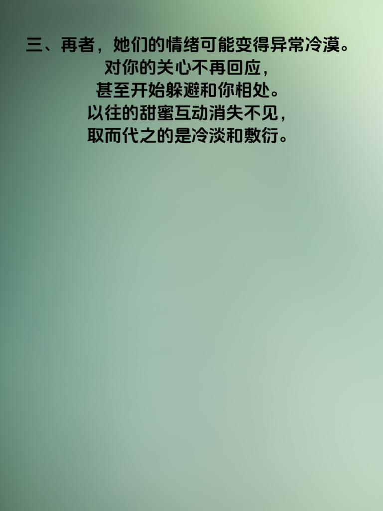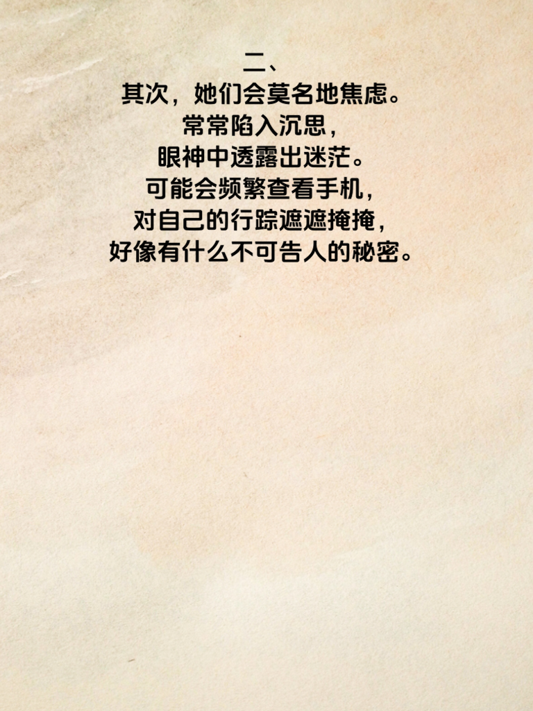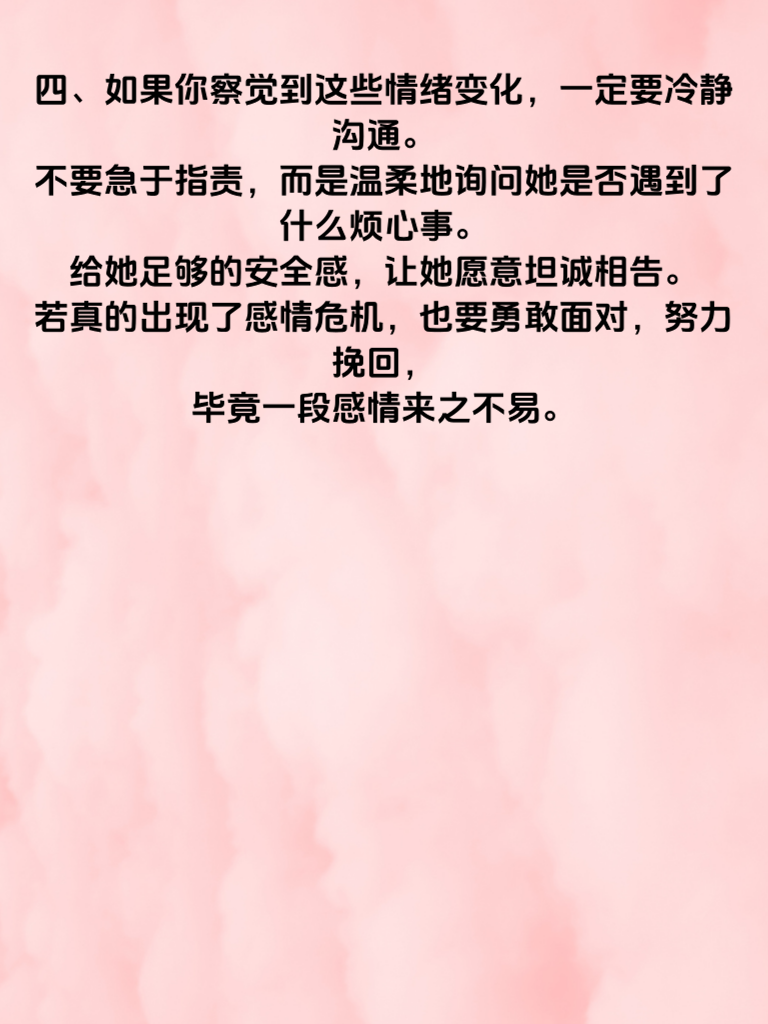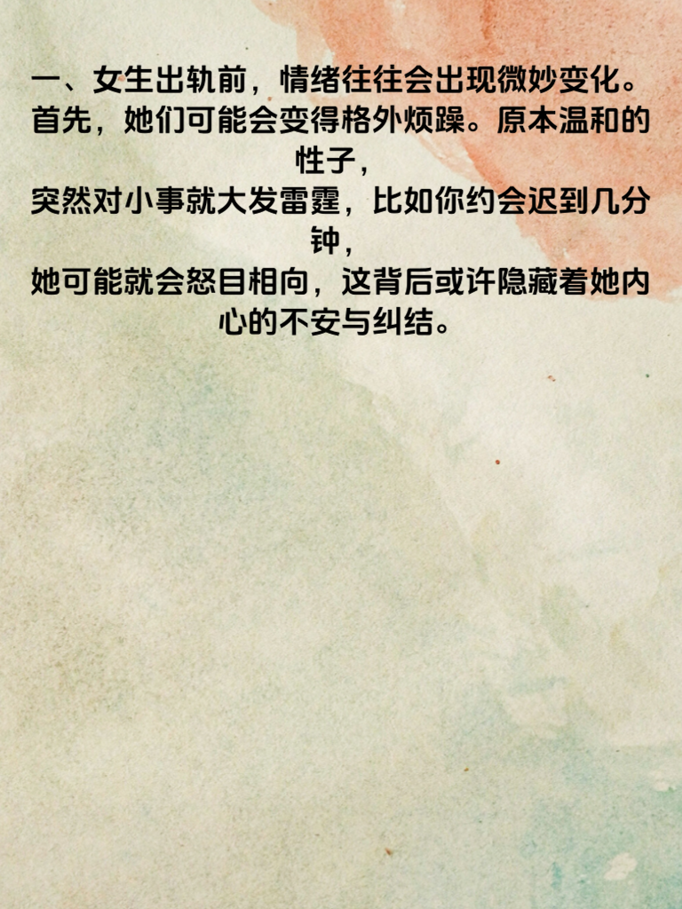 一、女生出轨前,情绪往往会出现微妙变化。首先,她们可能会变得格外烦躁。原本温和的性子,突然对小事就大发雷霆,比如你约会迟到几分钟,她可能就会怒目相向,这背后或许隐藏着她内心的不安与纠结。 二、其次,她们会莫名地焦虑。常常陷入沉思,眼神中透露出迷茫。可能会频繁查看手机,对自己的行踪遮遮掩掩,好像有什么不可告人的秘密。 三、再者,她们的情绪可能变得异常冷漠。对你的关心不再回应,甚至开始躲避和你相处。以往的甜蜜互动消失不见,取而代之的是冷淡和敷衍。 四、如果你察觉到这些情绪变化,一定要冷静沟通。不要急于指责,而是温柔地询问她是否遇到了什么烦心事。给她足够的安全感,让她愿意坦诚相告。若真的出现了感情危机,也要勇敢面对,努力挽回,毕竟一段感情来之不易。